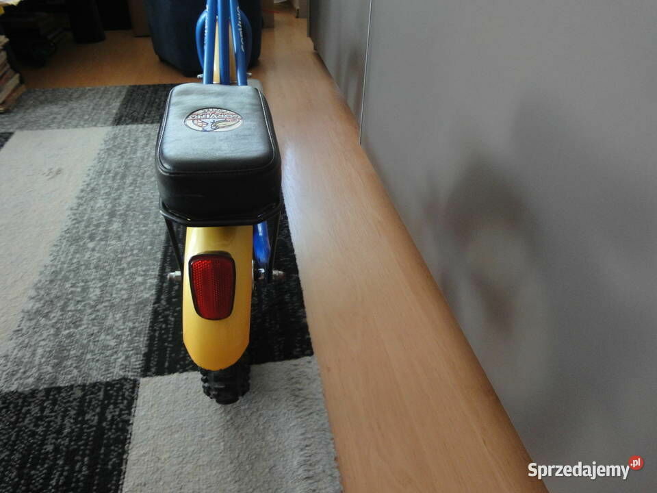 Hulajnoga w dobrym stanie wizualnym. Posiada ślady użytkowanie w postaci rys i obić wynikających z normalnego użytkowania. Ma regulowaną wysokość kierownicy a także jest na pompowanych kołach 12 calowych dzięki czemu chroni dziecko przed drganiami które mają zły wpływ na kręgosłup a także dają możliwość po mniej równej nawierzchni. Dla dziecka w wieku od 3 do 5lat Do hulajnogi trzeba dokupić dętkę o rozm12,5X2,25marcin