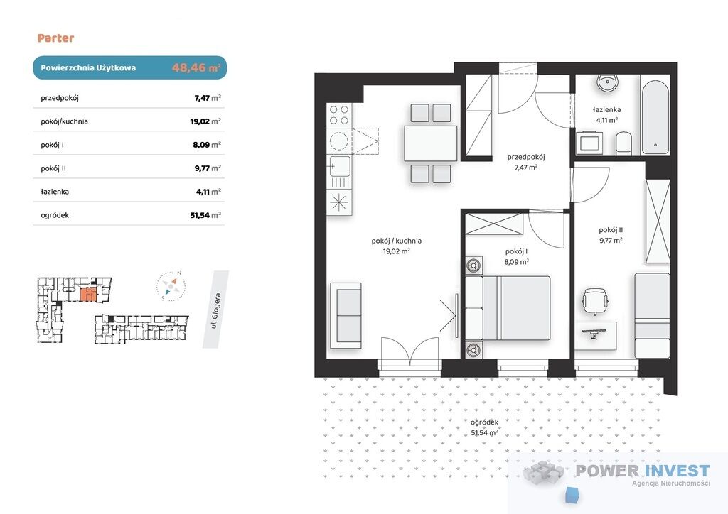 Mieszkanie znajduje się na parterze, ma powierzchnię 48,46 m2 i