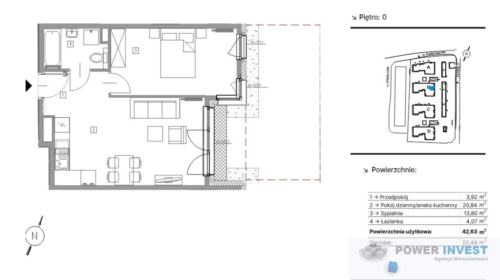 Mieszkanie znajduje się na parterze, ma powierzchnię 42,62 m2 i