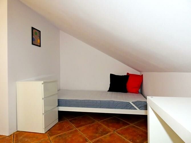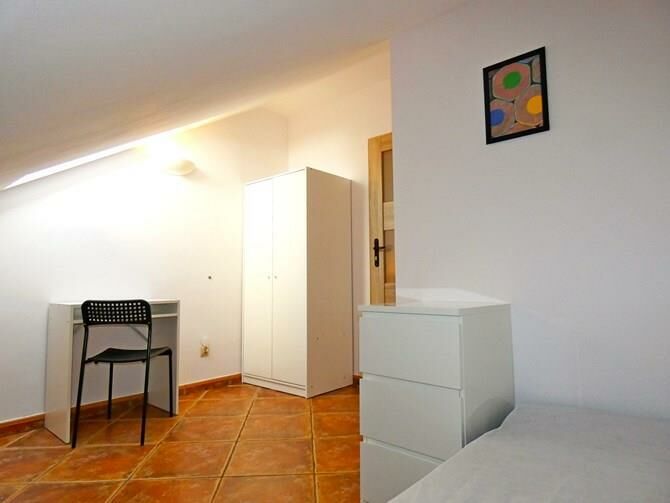 Pokój: łóżko, biurko z krzesłem, szafa dwudrzwiowa, szafka,