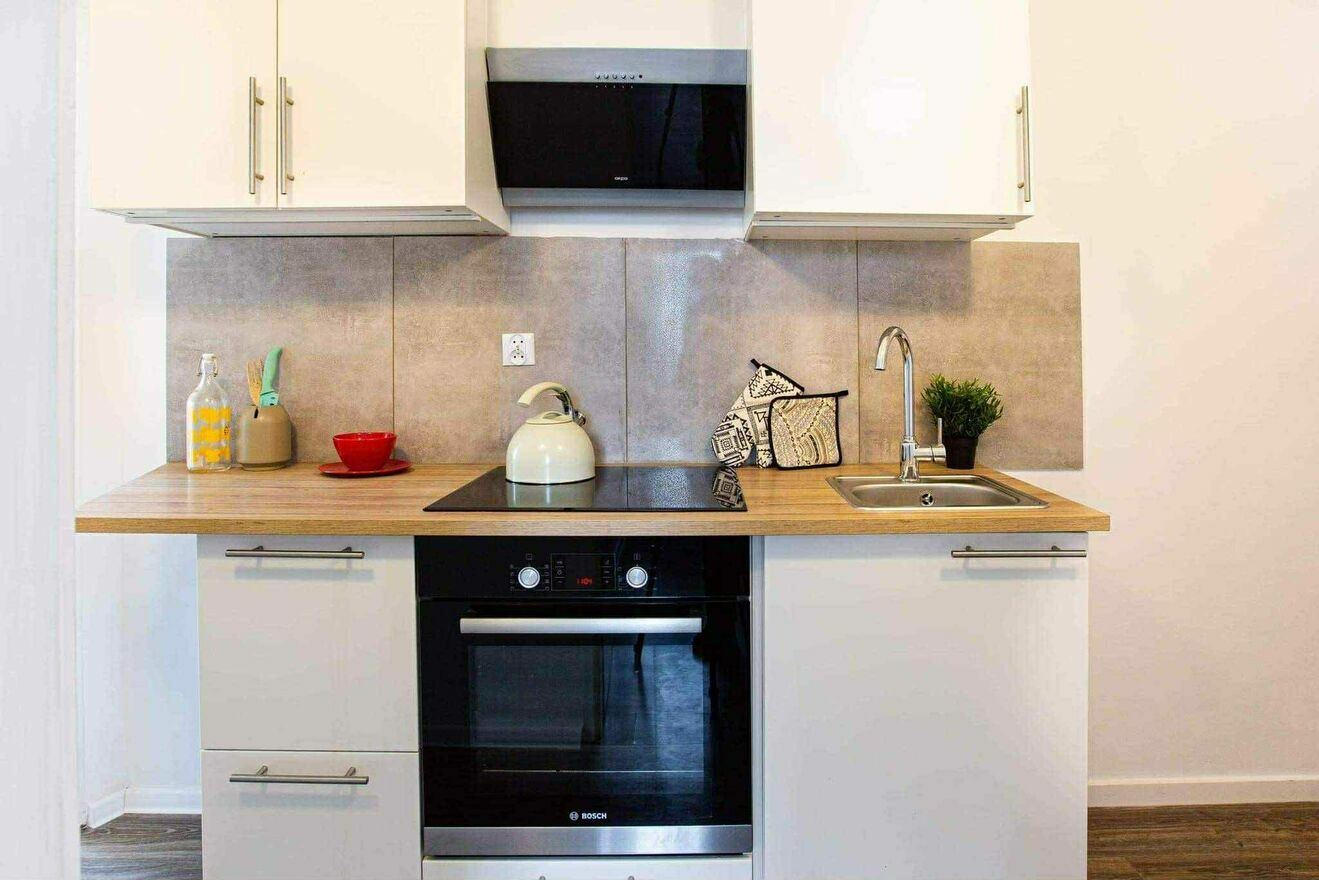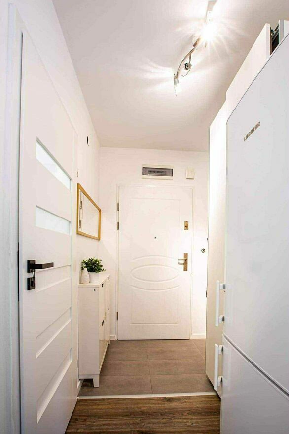 Mieszkanie jest w pełni wyposażone: piekarnik, brak gazu kuchenka na prąd, pralko suszarka, suszarka na ubrania, odkurzacz, czajnik, lodówka, deska do prasowania, żelazko.
