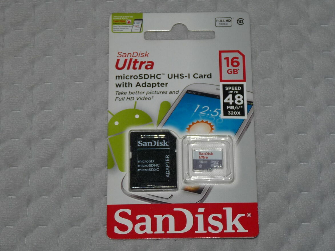 Karta pamięci micro SDHC SanDisk Ultra z adapterem. Nie używana, w oryginalnym opakowaniu. Idealna do nagrywania video Full HDPojemność: 16 GB.