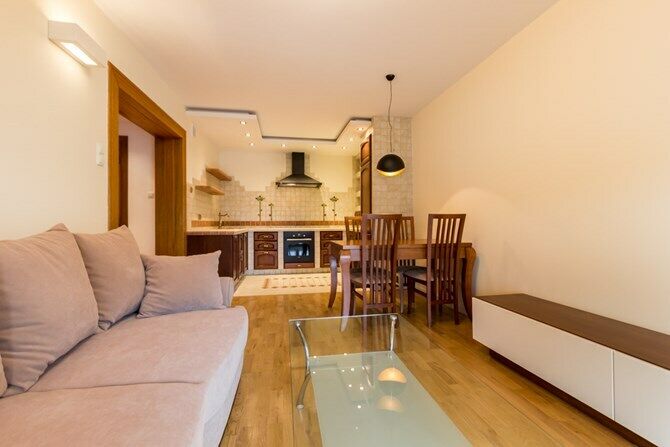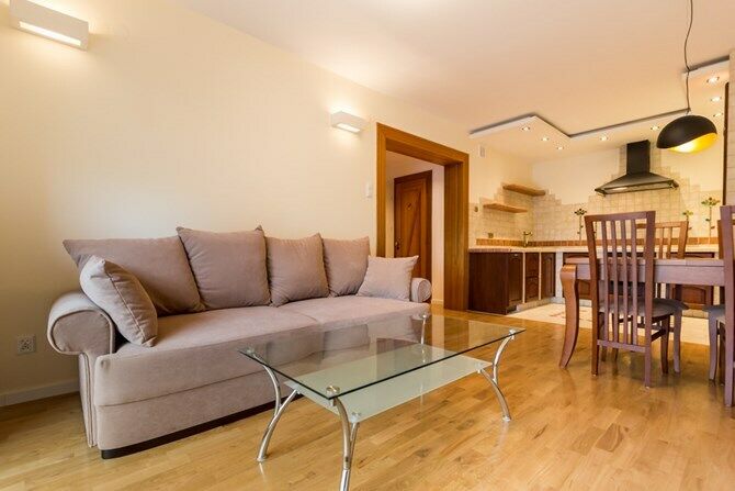 Salon: rozkładana kanapa, drewniany stół z 4 krzesłami, szklany