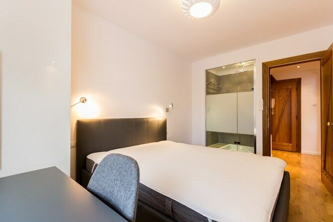 Sypialnia z dużym łóżkiem małżeńskim i prywatnym prysznicem.