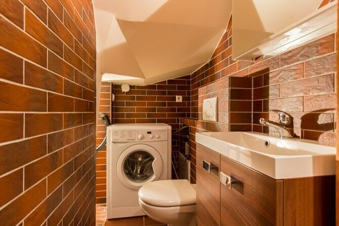 Osobna toaleta z umywalką i pralką.
