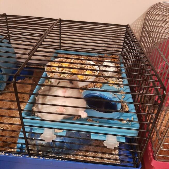 Klatka w dobrym stanie wraz z akcesoriami dla chomika(kółko, pojemnik do wody, miska do karmy.Mam jeszcze czerwona klatkę. ...
