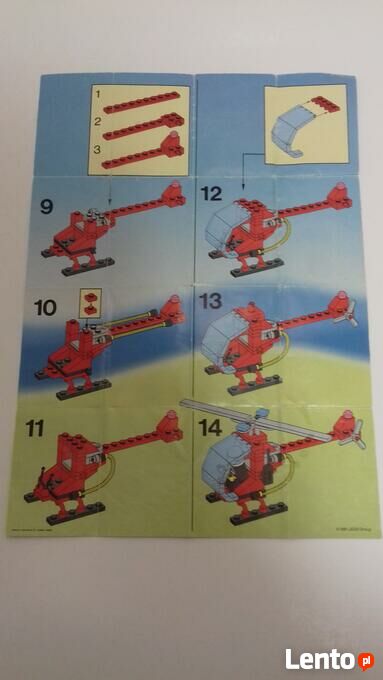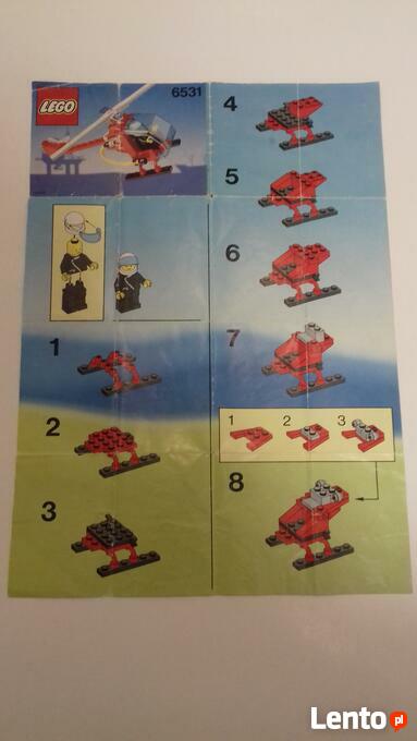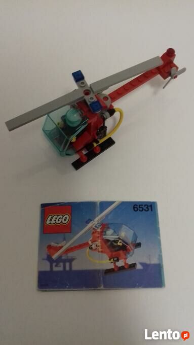 Do sprzedania zestaw klocków Lego System z serii Town – Strażacki śmigłowiec z działkiem wodnym (nr katalogowy 6531), wyprodukowany w Danii w 1991 roku. Zawiera 55 klocków, w tym figurka pilota, radiotelefon, otwierany dach, ruchome drążki sterownicze, ruchome śmigła. Brak oryginalnego opakowania. W komplecie oryginalna instrukcja składania.Klocki mało używane, w bardzo dobrym stanie, w opakowaniu zastępczym (jak na fotografiach). Możliwe drobne różnice w ilości i rodzaju klocków w stosunku do oryginału, mało istotne dla całości.
