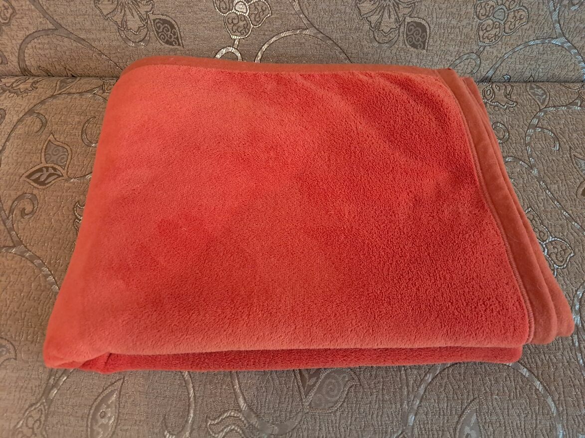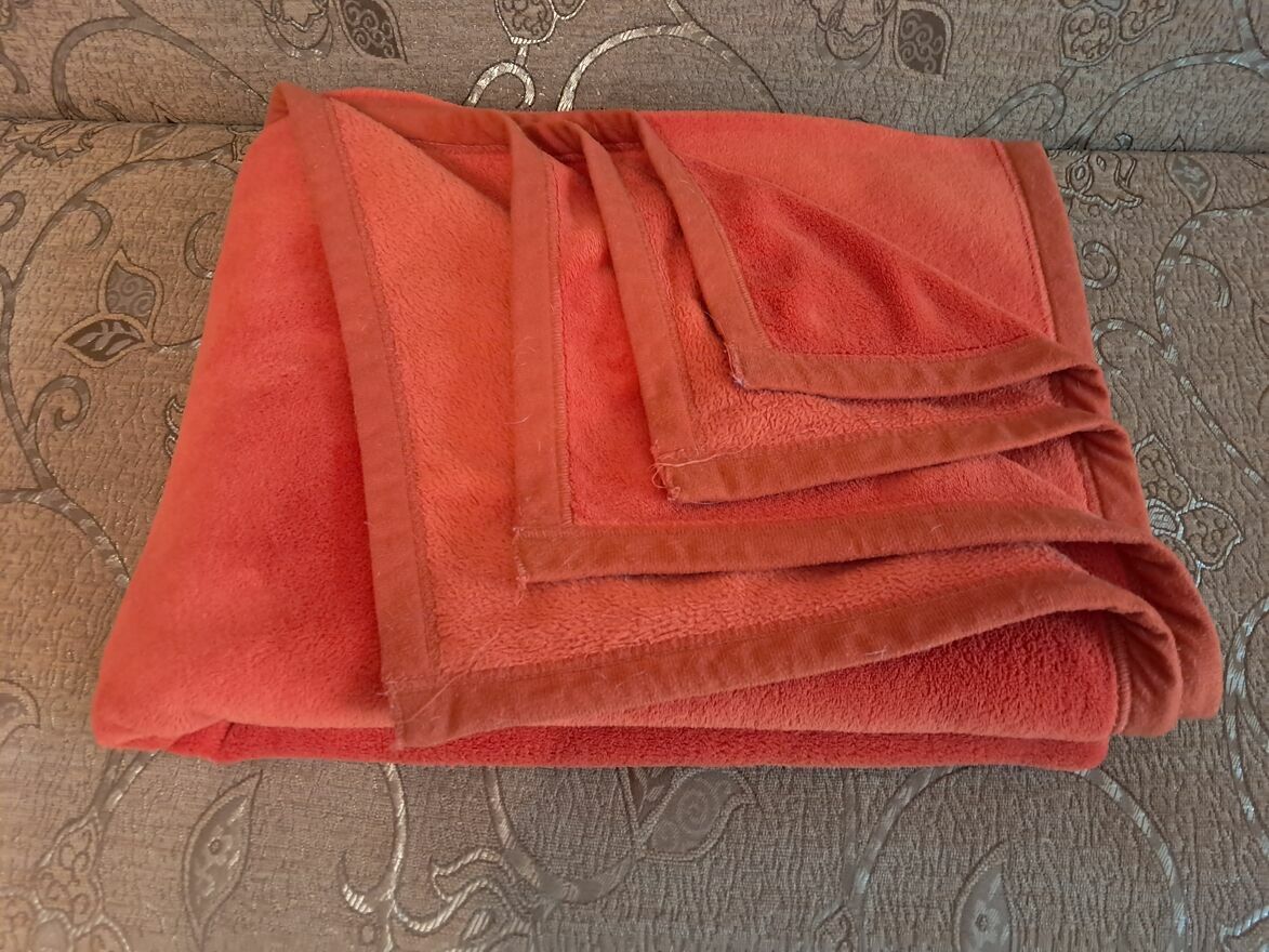 Do sprzedania duży, akrylowy, dwustronny koc, ciepły, miękki, bardzo delikatny, w kolorze pomarańczowym/czerwonym, gładki, o wymiarach w cm: 196 x 160.Koc bez istotnych śladów używania.