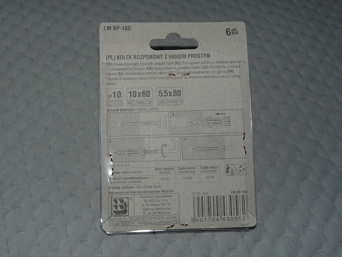 Kołki rozporowe z hakiem prostym 10 mm x 60 mm marki Wkręt-met Klimas. Nadają się idealnie do mocowania szafek, lamp, obrazów itp.Komplet nowy, nie otwierany jeszcze.