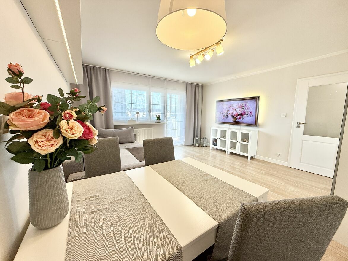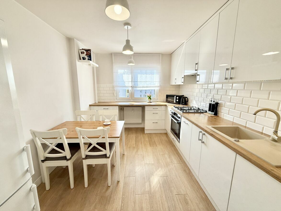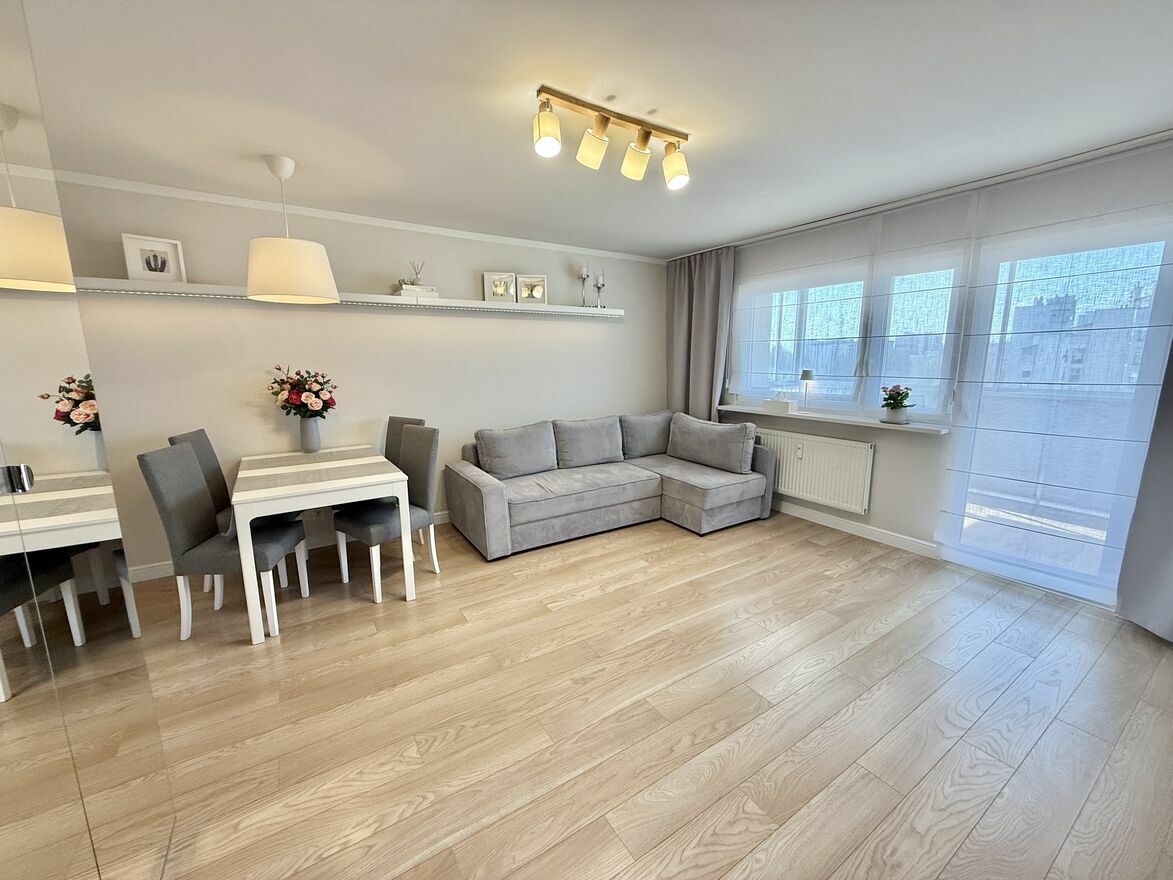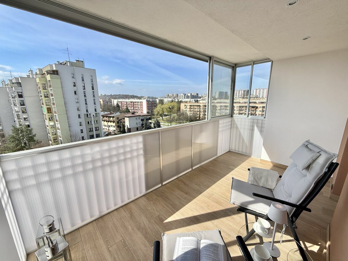 Jasne i przestronne mieszkanie na 7 piętrze, o powierzchni 58,5 m² z dużym, zabudowanym balkonem (9 m²) oraz piwnicą (2,5 m²). Mieszkanie przeszło gruntowny remont w 2019 roku, nowe meble, nowa instalacja 3-fazowa. Lokal składa się z dwóch pokoi: salonu i sypialni, a także osobnej, widnej kuchni, dużego przedpokoju oraz łazienki wyposażonej w wannę z prysznicem, deszczownicą i parawanem.Mieszkanie jest w pełni funkcjonalne i oferuje dużo miejsca do przechowywania – pojemne, lustrzane szafy znajdują się w przedsionku, korytarzu oraz salonie. Do dyspozycji najemcy są również dwa duże stoły (w tym rozkładany w salonie) oraz biurko do pracy. Na wyposażeniu w zabudowie kuchennej znajduje się pralka i zmywarka.