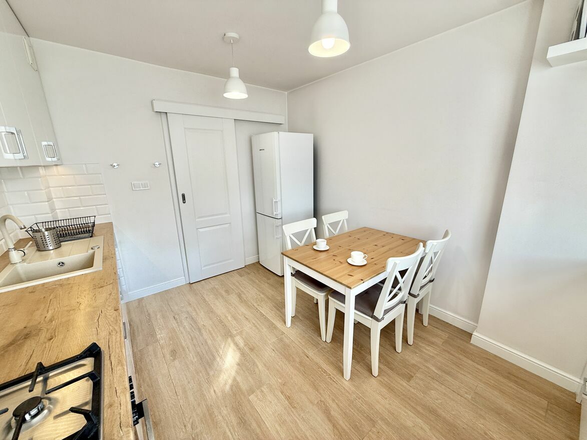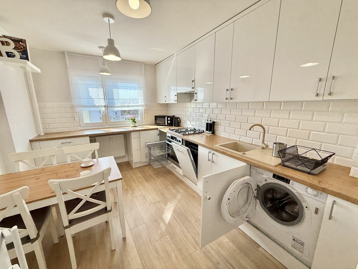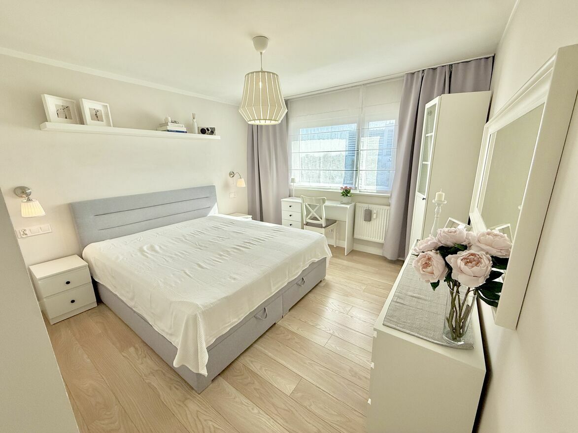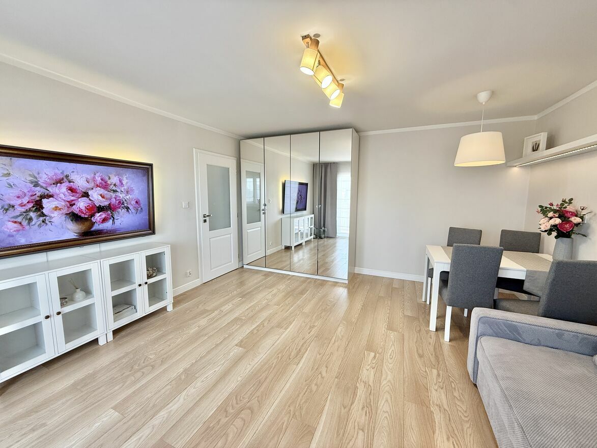 Jasne i przestronne mieszkanie na 7 piętrze, o powierzchni 58,5 m² z dużym, zabudowanym balkonem (9 m²) oraz piwnicą (2,5 m²). Mieszkanie przeszło gruntowny remont w 2019 roku, nowe meble, nowa instalacja 3-fazowa. Lokal składa się z dwóch pokoi: salonu i sypialni, a także osobnej, widnej kuchni, dużego przedpokoju oraz łazienki wyposażonej w wannę z prysznicem, deszczownicą i parawanem.Mieszkanie jest w pełni funkcjonalne i oferuje dużo miejsca do przechowywania – pojemne, lustrzane szafy znajdują się w przedsionku, korytarzu oraz salonie. Do dyspozycji najemcy są również dwa duże stoły (w tym rozkładany w salonie) oraz biurko do pracy. Na wyposażeniu w zabudowie kuchennej znajduje się pralka i zmywarka.