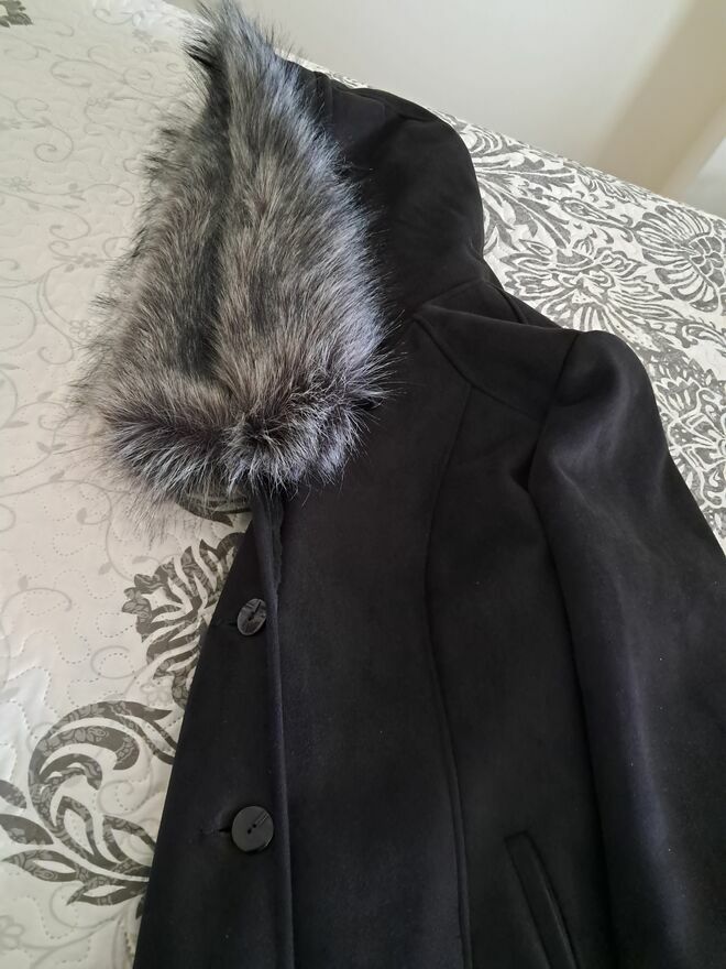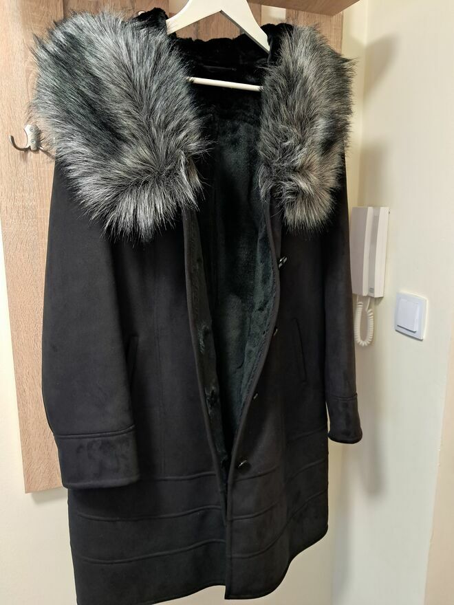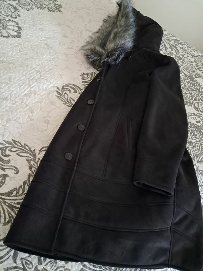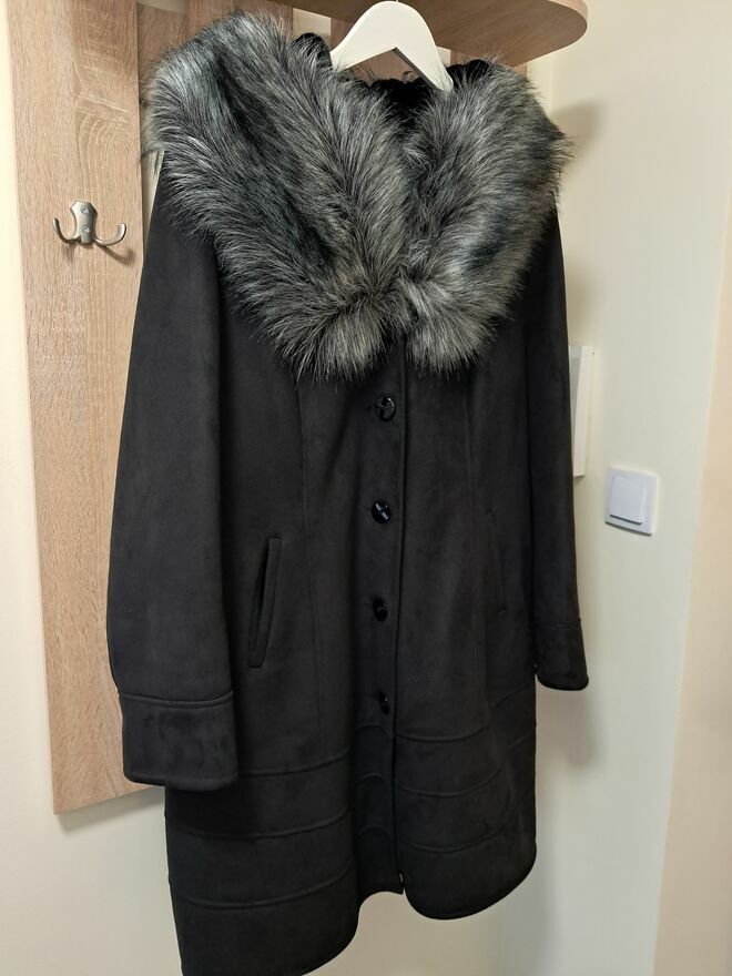 Kożuch damski, długi, czarny z kapturem, rozm. 44/46