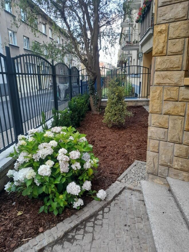 Posesja jest ogrodzona. Wejście przez furtkę z domofonem.