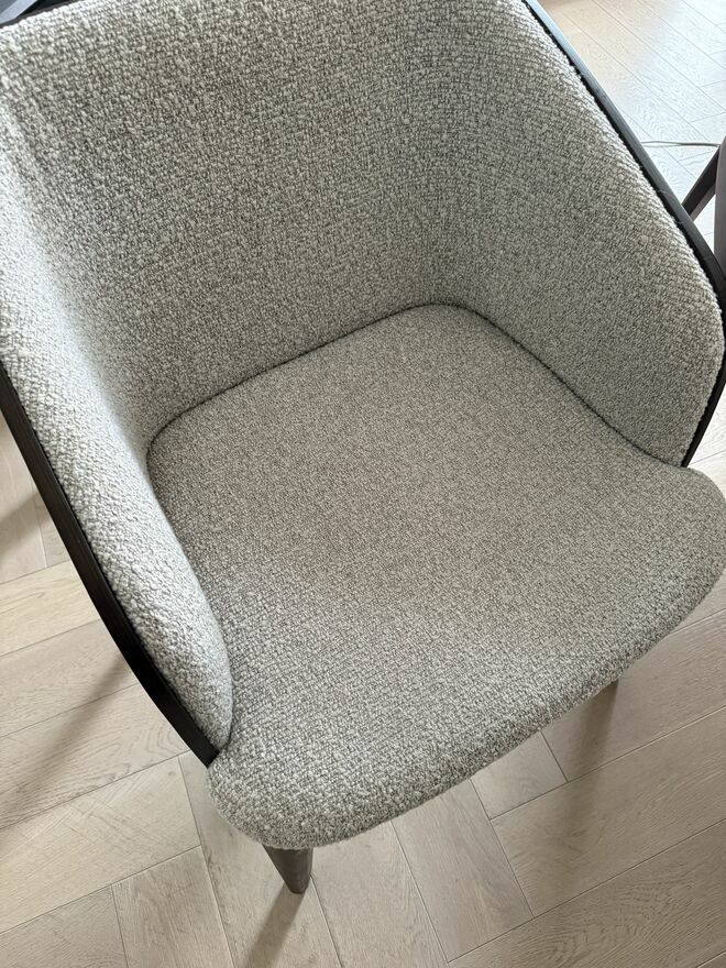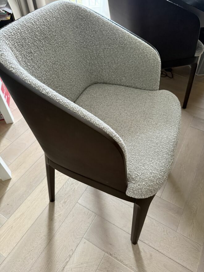 Wygodne, tapicerowane krzesła w szarym kolorze. Mebel jest używany, ale w bardzo dobrym stanie bez śladów użytkowania.Krzesła były robione na zamówienie z naturalnego dębu.