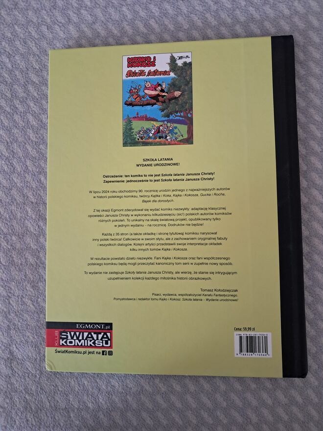 Do sprzedania komiks z serii „Kajko i Kokosz” - „Szkoła latania”, wg Janusza Christy, wydany (wydanie urodzinowe) w 2024 roku przez wydawnictwo „Story House Egmont” sp. z o.o. ISBN 978-83-281-7036-0. Komiks jest adaptacją klasycznej opowieści Janusza Christy, w wykonaniu kilkudziesięciu polskich autorów komiksów, wydaną z okazji 90-tej rocznicy urodzin autora. Książka w twardej kolorowej oprawie, liczy 56 stron. Wymiary w mm: 290 x 222 x 11.Komiks nowy.
