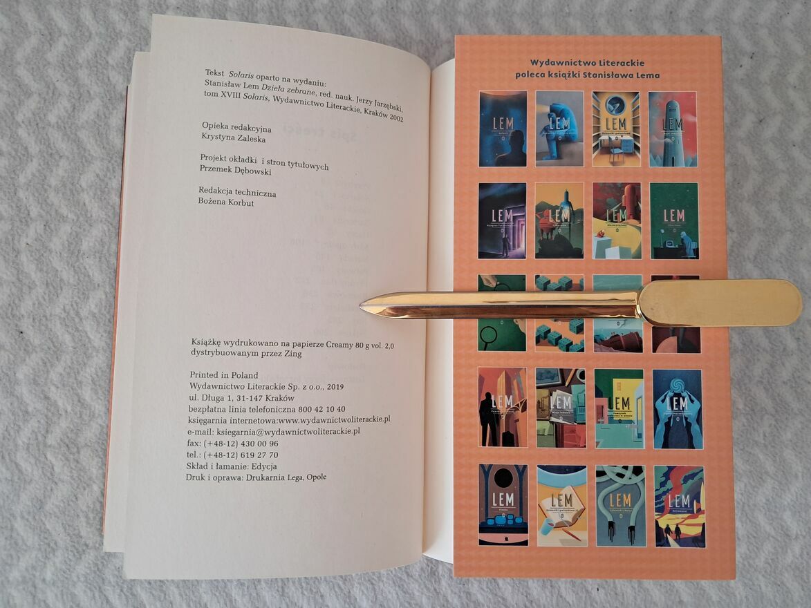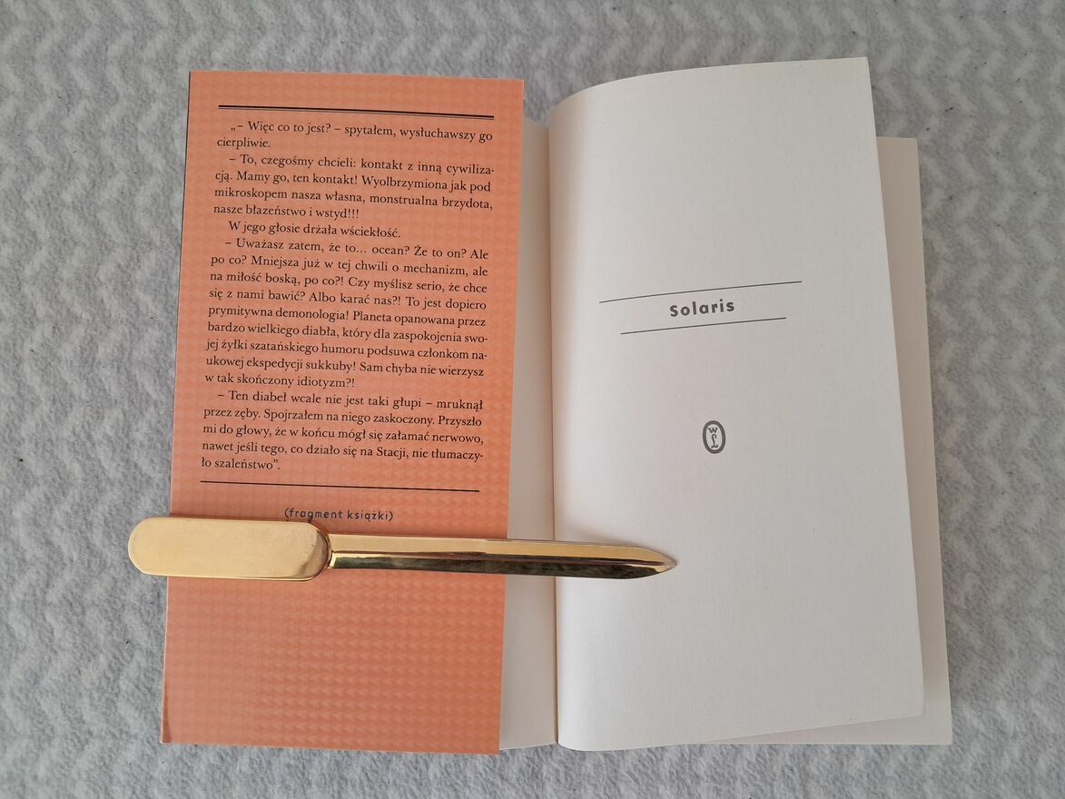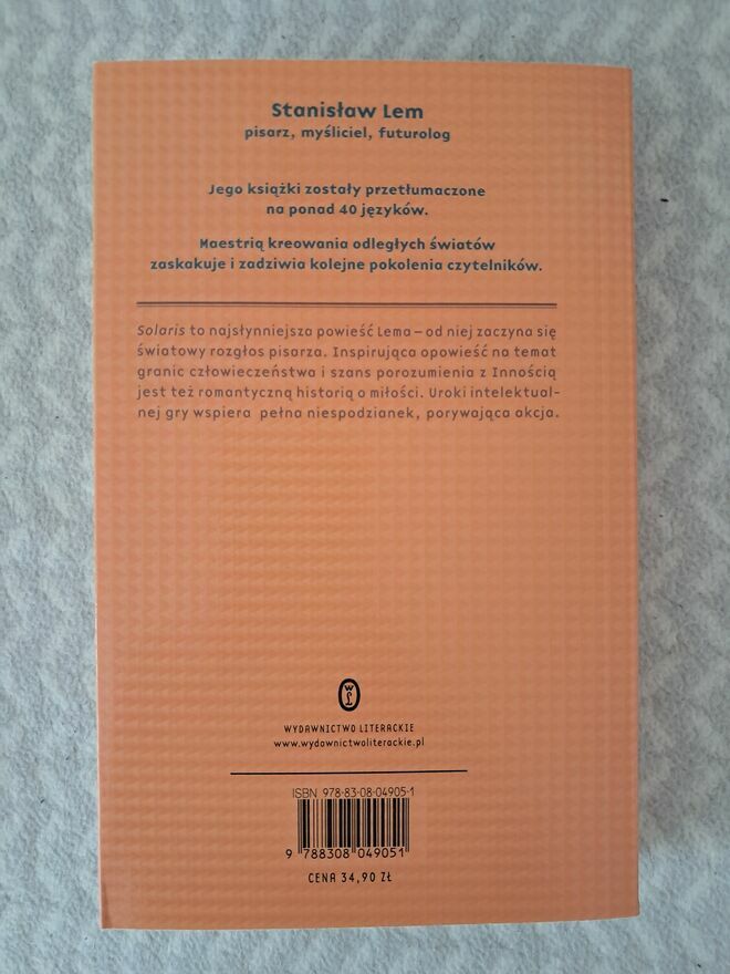 Do sprzedania książka „Solaris”, autorstwa Stanisława Lema, opatrzona Posłowiem Jerzego Jarzębskiego, z opracowaniem graficznym Przemka Dębowskiego, wydana w 2019 roku przez Wydawnictwo Literackie Sp. z o.o. w Krakowie. ISBN 978-83-08-04905-1. Książka w miękkiej kolorowej oprawie (papier kredowy) ze skrzydełkami, wydrukowana dużą czcionką, liczy 340 stron. Wymiary w mm: 195 x 122 x 28.Książka nowa, pełnowartościowa.
