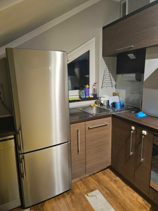 W cenie lodówka Liebher, piekarnik i okap Amica, zmywarka zanussi.