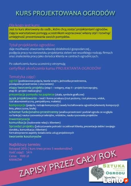 Dla kogo jest kurs:Jest to kurs skierowany do osób , które chcą zostać projektantami ogrodów. Zajęcia warsztatowe pomogą uczestnikom wypracować własny styl i rozwinąć umiejętność prezentowania swoich pomysłów.