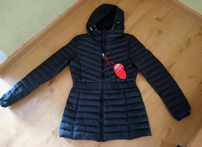 Do sprzedania kurtka damska z kapturem, w kolorze beżowym, pikowana, ocieplana, zapinana na zamek błyskawiczny i pięć ...