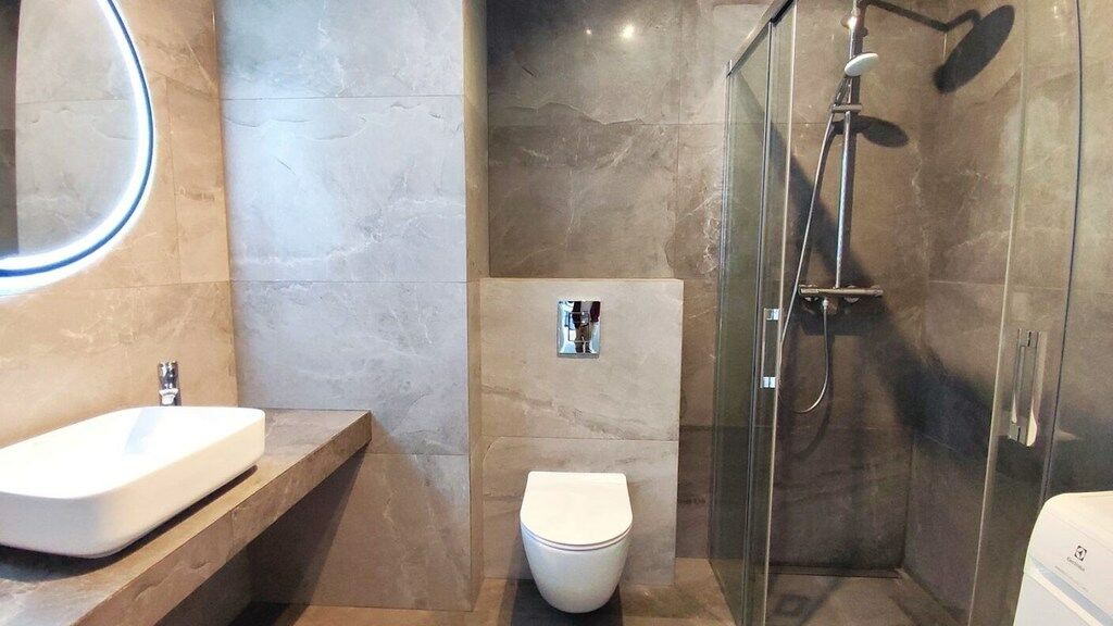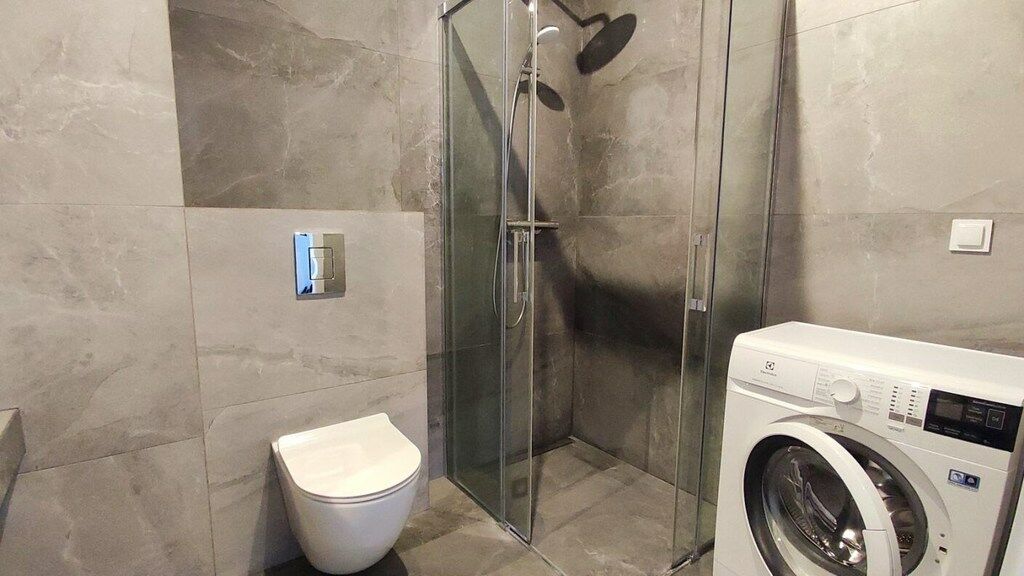 Łazienka: kabina prysznicowa, umywalka, pralka, WC.