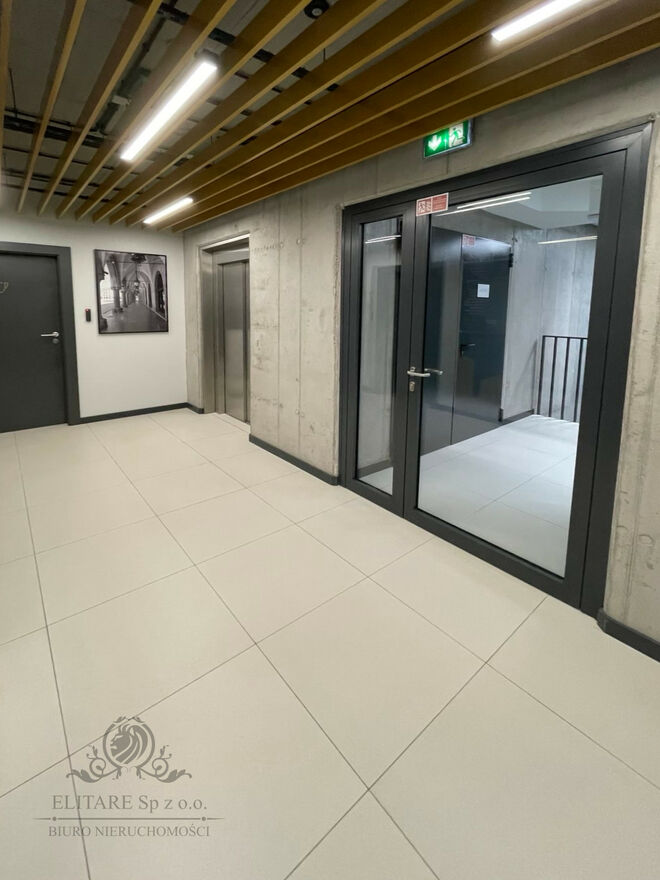 Powierzchnia lokalu to 56,59m2, na którą składa się jedna duża otwarta przestrzeń o regularnym kwadratowym kształcie, doświetlona 3 dużymi oknami nieotwieralnymi. Wysokość mieszkania od 280 do 300cm. Lokal jednostronny. W oknach znajdują się rolety zacieniające, na podłodze wysokiej jakości wykładzina biurowa, ściany w kolorze jasnym, sufit zostawiony w surowym przemysłowym stylu z dobranymi sufitowymi lampami. Ogrzewanie i klimatyzacja z manipulatorem naściennym Mitsubishi. Sanitariaty nowocześnie wykończone dostępne z korytarza wspólnego. W ofercie też jedno miejsce postojowe w garażu podziemny z bramą na pilota.