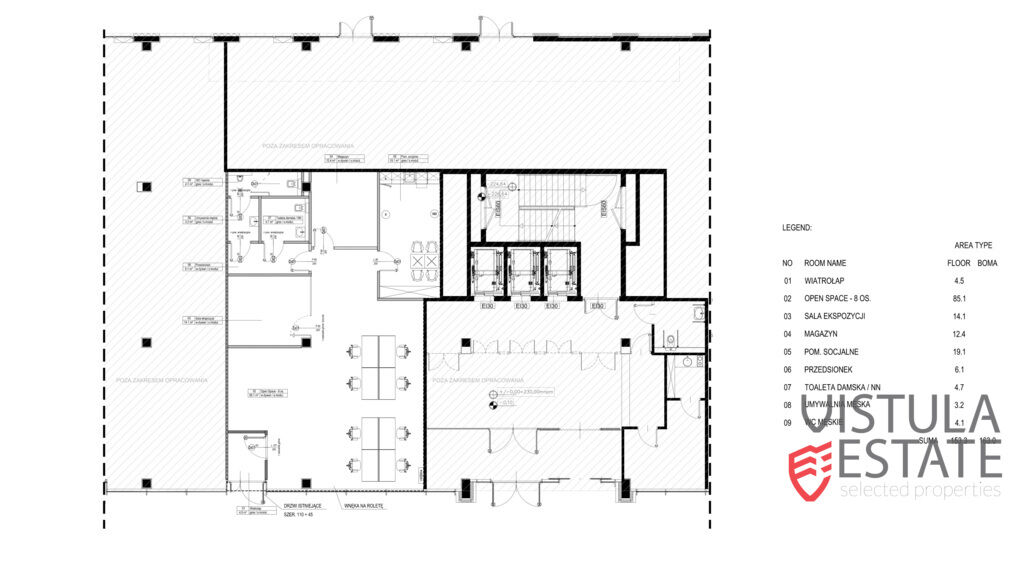Powierzchnia lokalu to 173 m2 brutto, na którą składają się: open