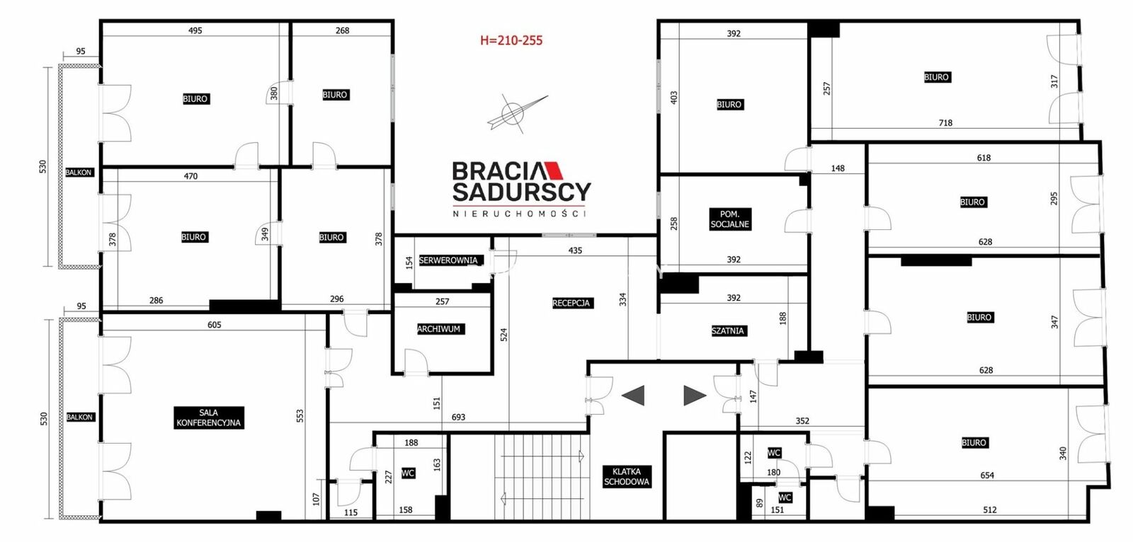 recepcja, 2 sale konferencyjne,8 wydzielonych pomieszczeń biurowych