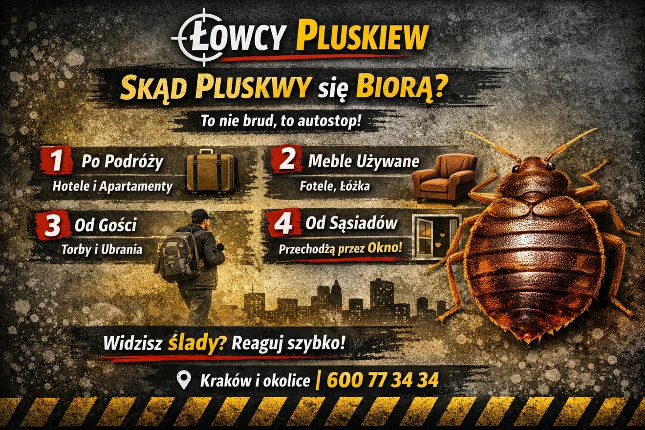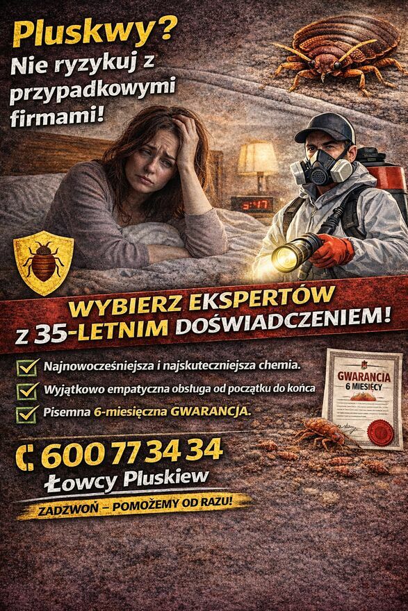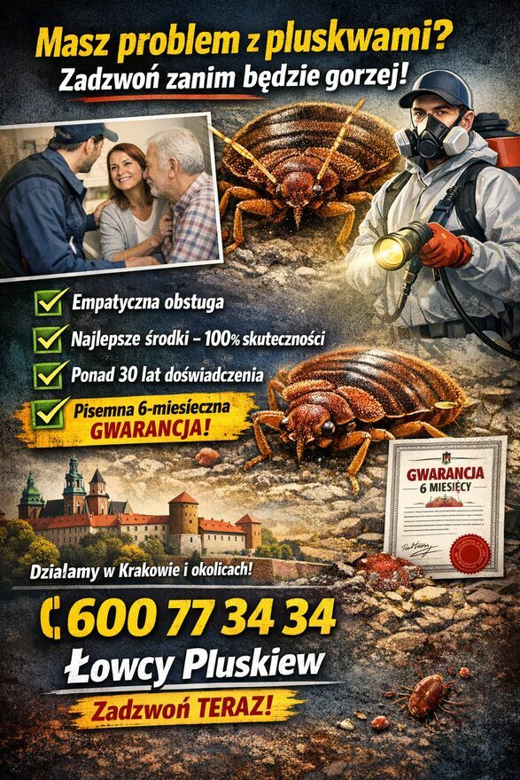 Łowcy Pluskiew Kraków i okolice profesjonalne usuwanie pluskiew.Zajmujemy się profesjonalnym usuwaniem pluskiew. Posiadamy ponad 35 letnie doświadczenie w zakresie usuwania owadów. Korzystamy z najnowszych najlepszych i najdroższych środków chemicznych na rynku europejskim. Jako jedyni w Polsce dajemy 6 miesięczną pisemną gwarancję na swoje usługi. Mammy najlepszą ofertę na rynku.