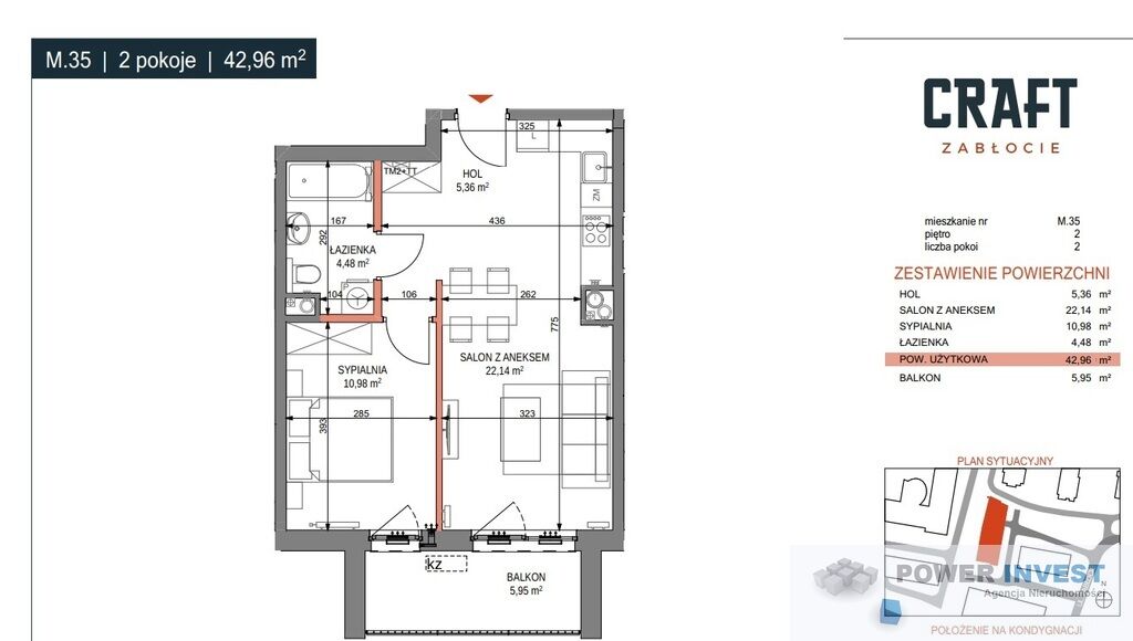 – dwupokojowe mieszkanie o powierzchni 42,96 m2 z balkonem o