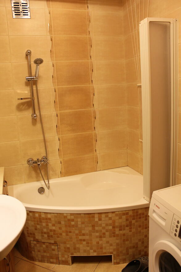 - łazienka z piecem gazowym 2 funkcyjnym z zamkniętą komorą spalania (max bezpieczeństwo domowników)-możliwość pełnego sterowania ogrzewaniem wody użytkowej i CO, umywalka, wanna, pralka, lustro,