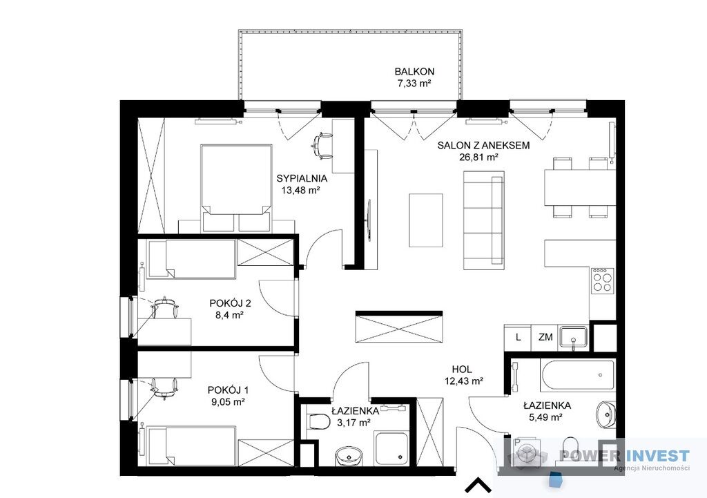 – czteropokojowe mieszkanie o powierzchni 78,83 m2 z balkonem o
