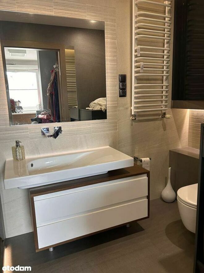• Łazienka (4,8 m²): Wygodny pokój kąpielowy, bez ścisku.Wbudowane szafki,zabudowana pralka .