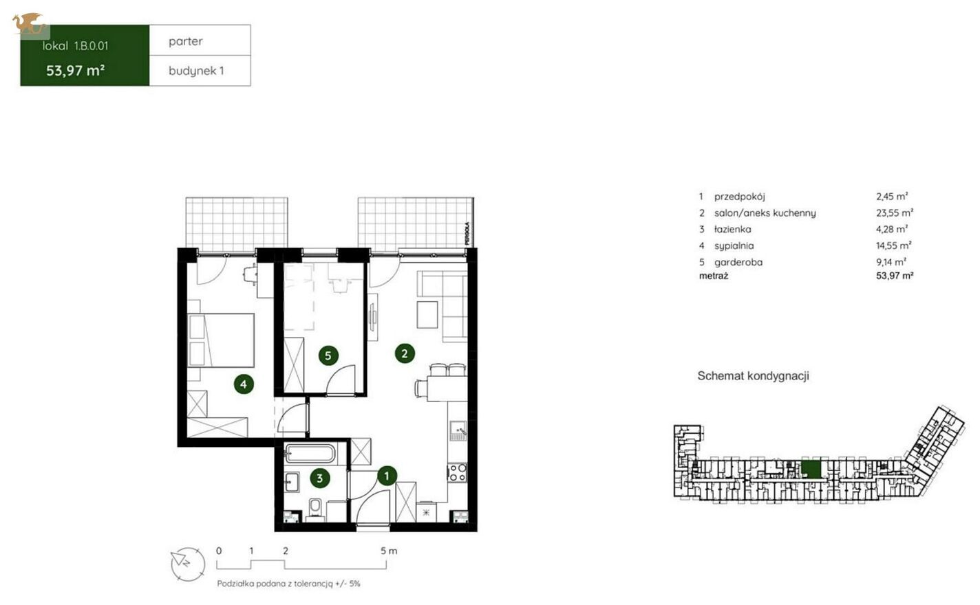 Mieszkanie o powierzchni 53,97 m2 znajduje się na parterze (0 piętro) i posiada ekspozycję na wschód (E), co sprzyja przyjemnemu porannemu doświetleniu. Budynek wyposażony jest w windę.