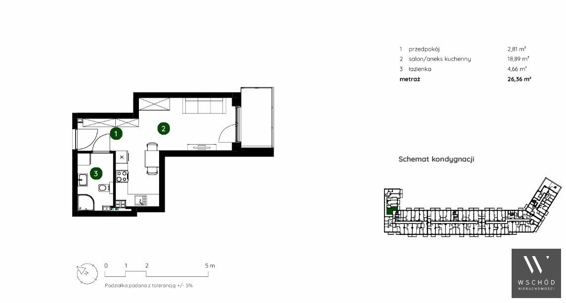 Mieszkanie składające się z kuchni, pokoju, łazienki oraz balkonu