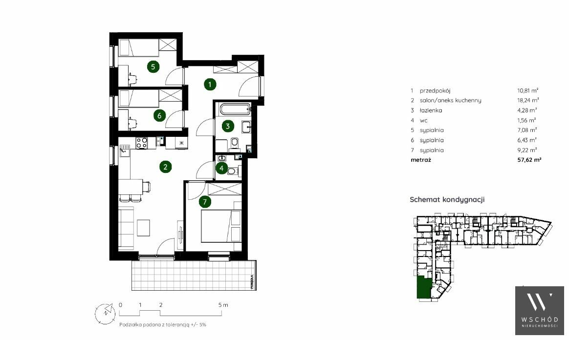 Mieszkanie składające się z salonu z aneksem kuchennym, trzech sypialni, przedpokoju, łazienki, WC , przedpokoju oraz narożnego ogródka o pow. 51m2