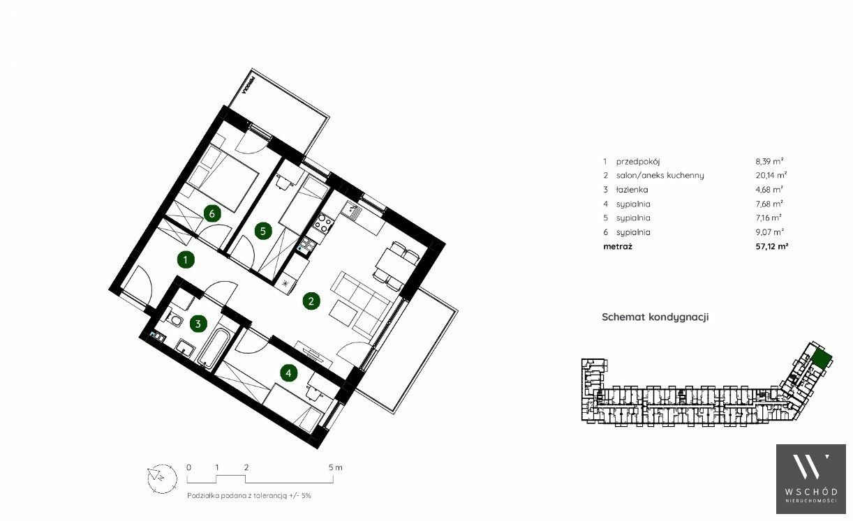 Mieszkanie składające się z salonu z aneksem kuchennym, trzech sypialni, przedpokoju, łazienki, oraz dwóch balkonów