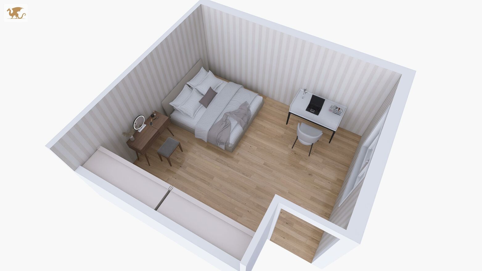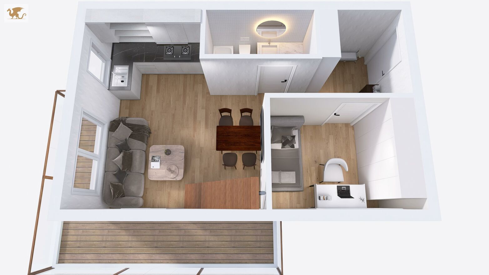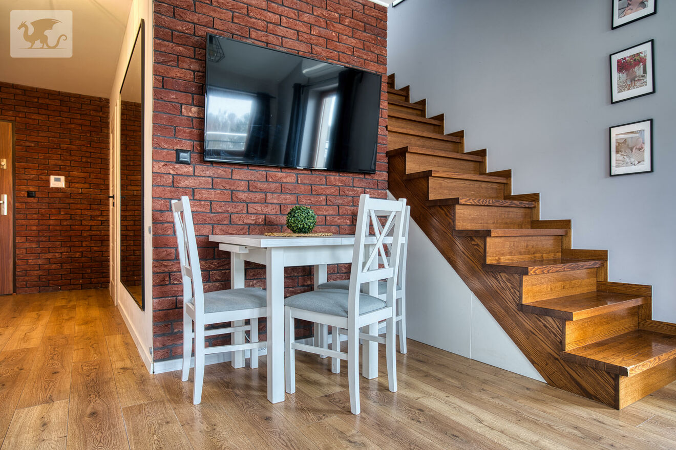 Układ jest praktyczny i czytelny. Wejście prowadzi do korytarza, z którego masz dostęp do pokoju oraz łazienki, a dalej przejście do salonu z aneksem kuchennym. Z salonu wychodzisz na duży balkon w kształcie litery L. Z salonu prowadzą także schody na antresolę - po podłodze ma ona ok. 20 m2, natomiast do powierzchni użytkowej mieszkania wliczono ok. 10 m2 (pozostała część jest pod skosami). W praktyce skosy nie są bardzo odczuwalne, dzięki czemu antresola jest wygodną, pełnowartościową przestrzenią do pracy, sypialni, strefy relaksu lub przechowywania.