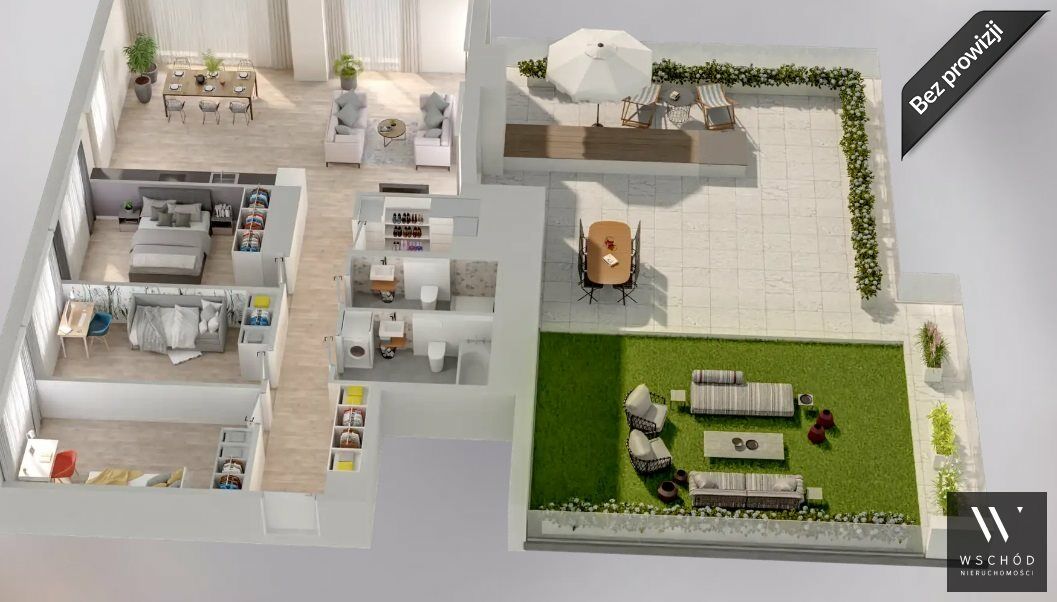 Mieszkanie składające się z salonu z aneksem kuchennym, trzech sypialni, przedpokoju , łazienki, WC, garderoby oraz wyjątkowego tarasu o pow. 107m2
