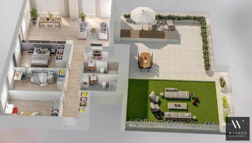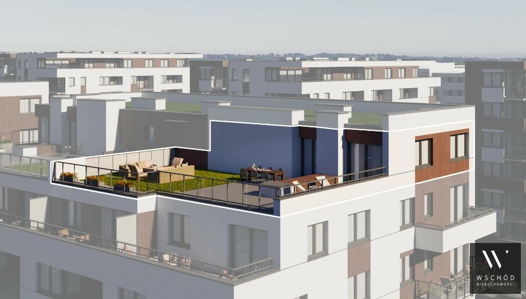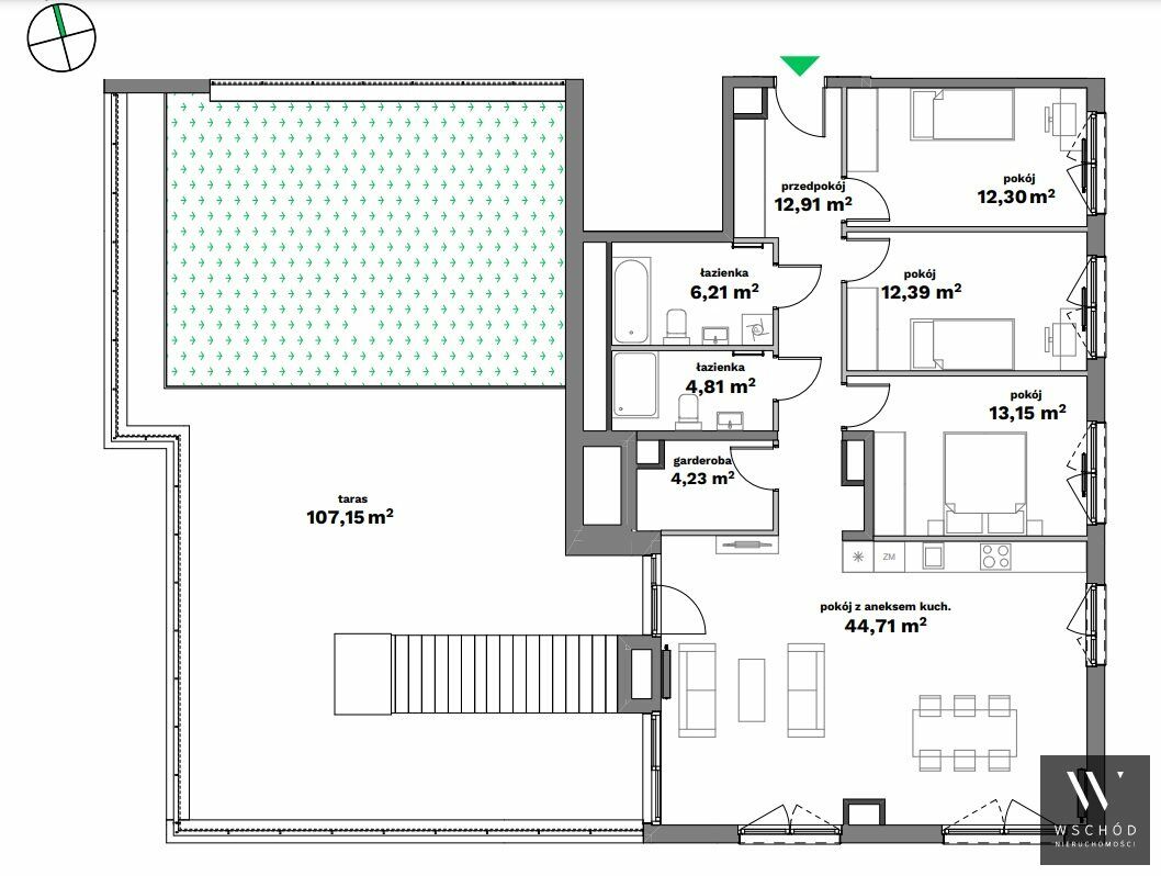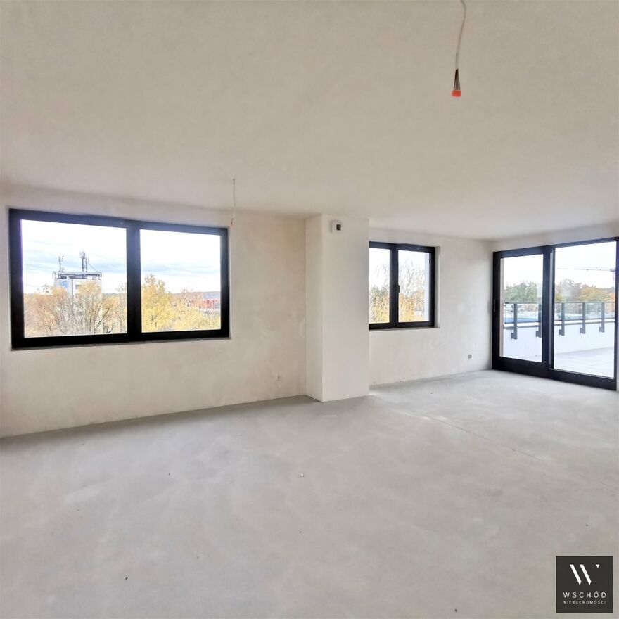 Mieszkanie składające się z przestronnego salonu z aneksem kuchennym, trzech sypialni, przedpokoju , łazienki, WC, garderoby oraz widokowego tarasu o pow. 107m2