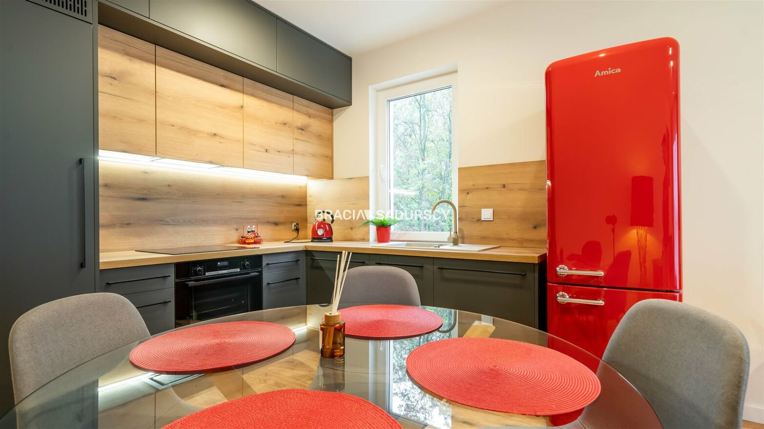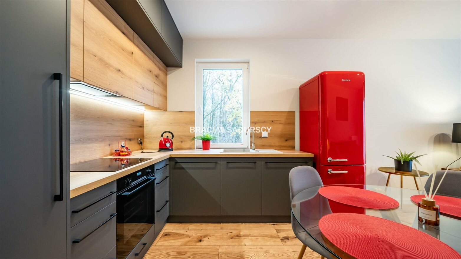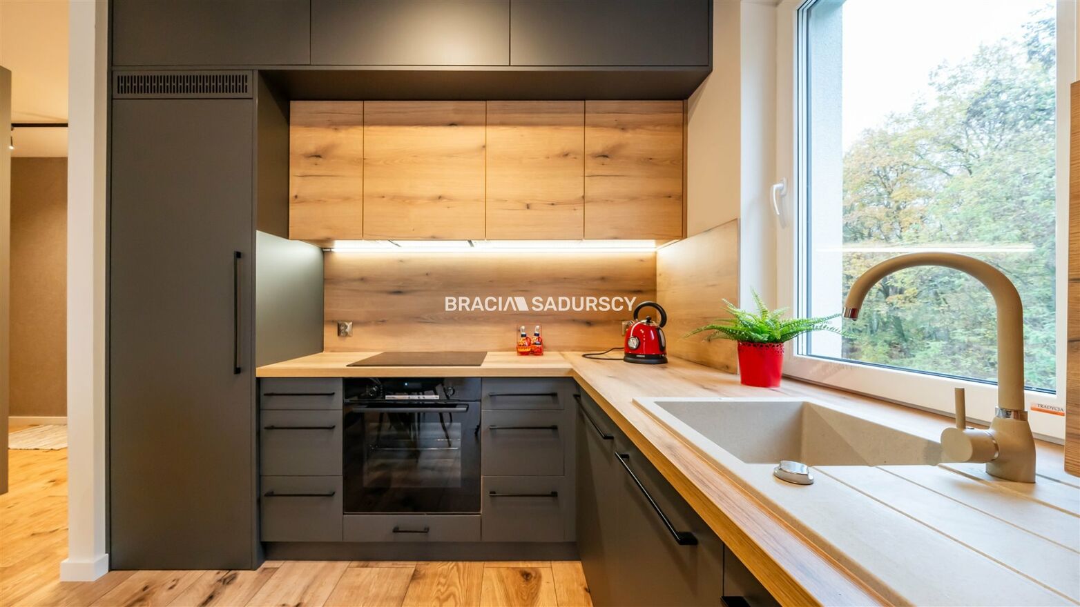 Wyposażenie kuchni: lodówko-zamrażarka,, meble kuchenne na wymiar, zmywarka, płyta indukcyjna, piekarnik elektryczny |