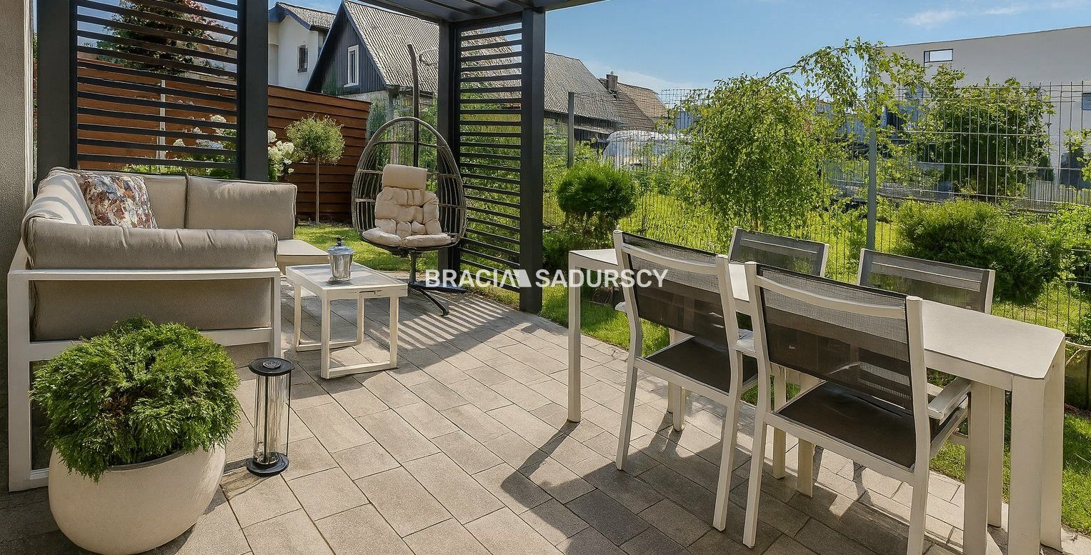 Do mieszkania przynależy zadbany ogródek o powierzchni ok. 4 arów. Taras z drewnianą pergolą z zadaszeniem z poliwęglanu pozwala korzystać z przestrzeni niezależnie od pogody; w ogrodzie można zaaranżować wielogatunkowe rośliny, które przez cały rok będą cieszą oko.