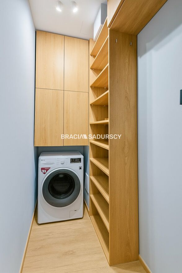 - Pralnio‑spiżarnia z pralko‑suszarką, regałem i szafkami do przechowywania.