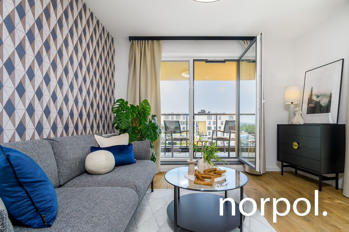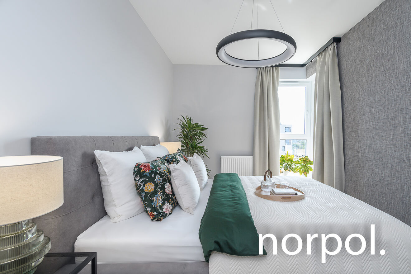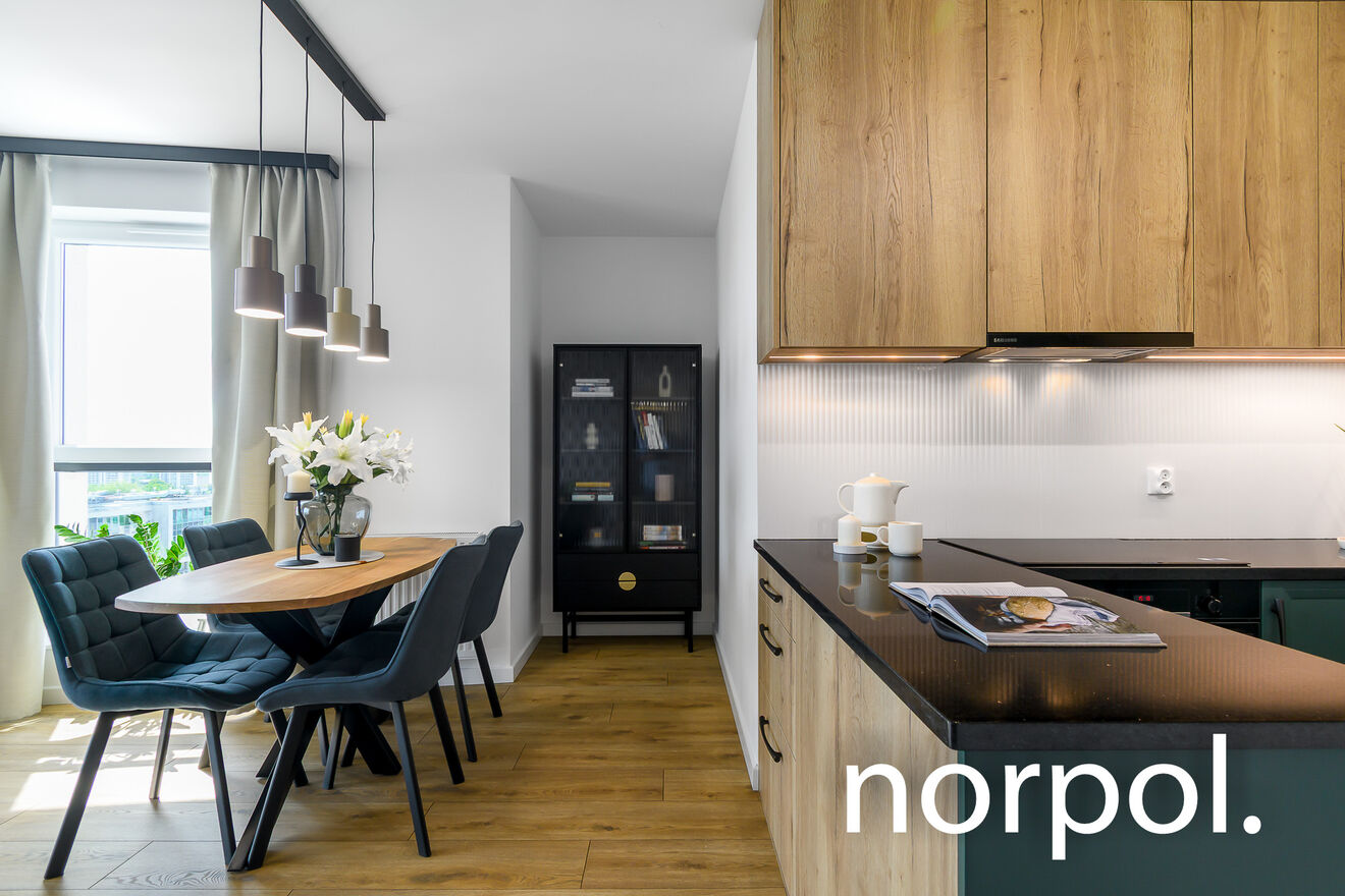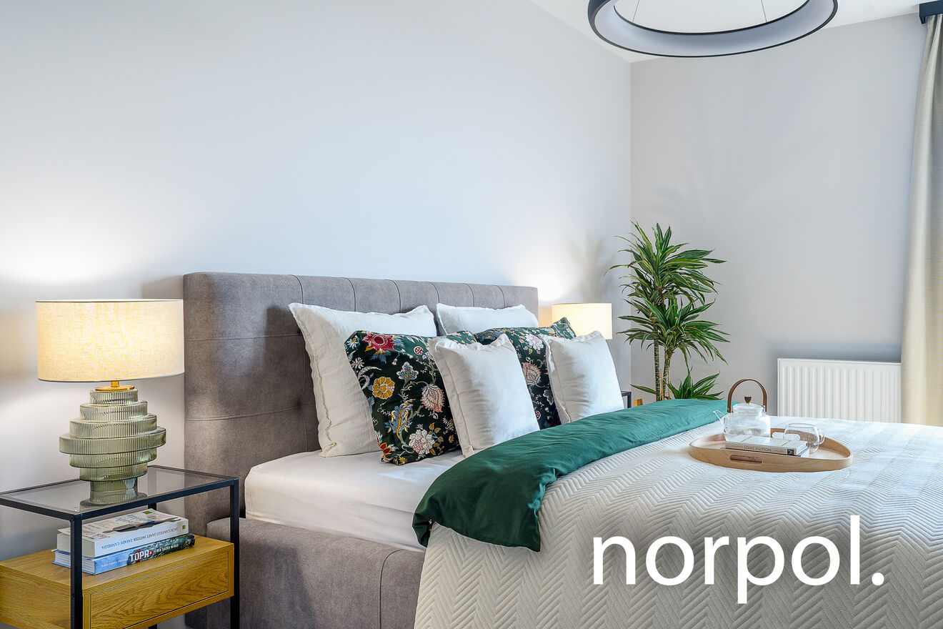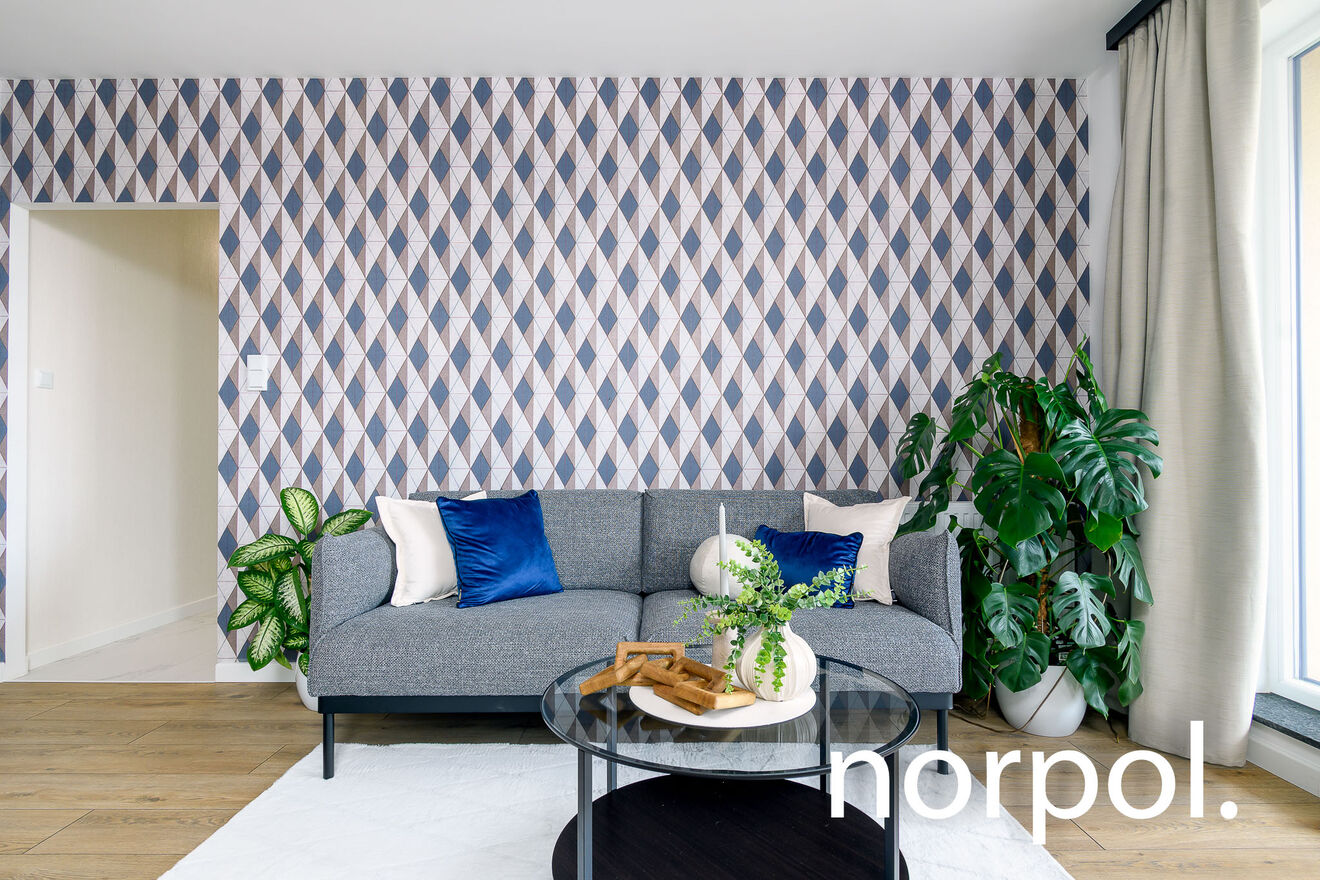 The interior has been finished with meticulous attention to detail and high-quality materials. Subdued colors inspired by nature dominate, creating a cohesive and elegant whole. The walls feature plaster and latex paints, complemented by stylish wallpaper from renowned manufacturers. The floors in the living area and bedroom are finished with durable, highly abrasion-resistant panels, while the entrance and kitchen areas feature large-format tiles in a light, marble style.