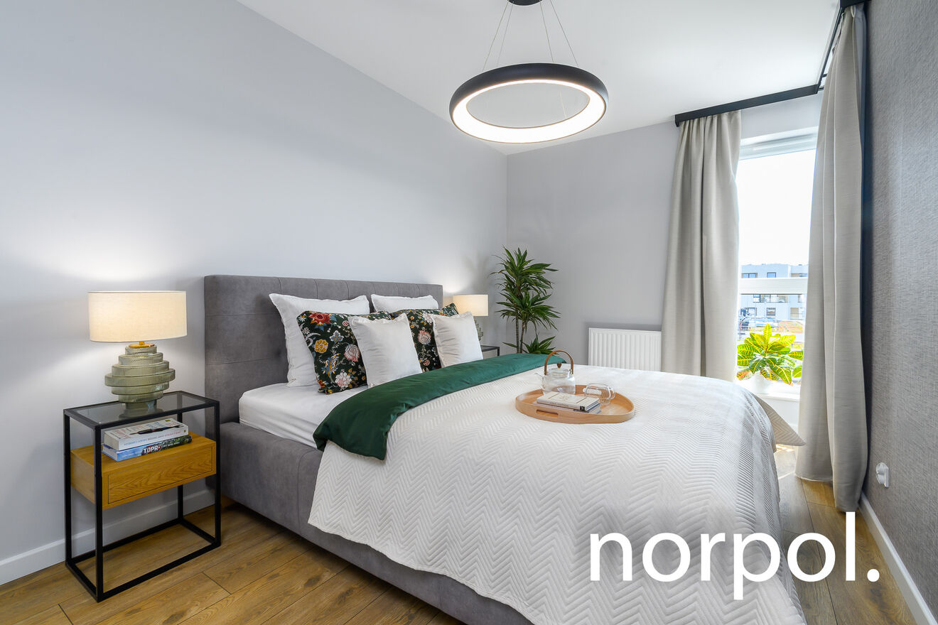 Wnętrze zostało wykończone z dużą dbałością o detale oraz przy użyciu materiałów wysokiej jakości. Dominują stonowane kolory inspirowane naturą, które tworzą spójną i elegancką całość. Na ścianach zastosowano gładzie oraz farby lateksowe, uzupełnione stylowymi tapetami renomowanych producentów. Podłogi w części dziennej i sypialni wykończono trwałymi panelami o wysokiej klasie ścieralności, natomiast w strefie wejścia i kuchni zastosowano wielkoformatowe płytki w jasnej, marmurowej stylistyce.