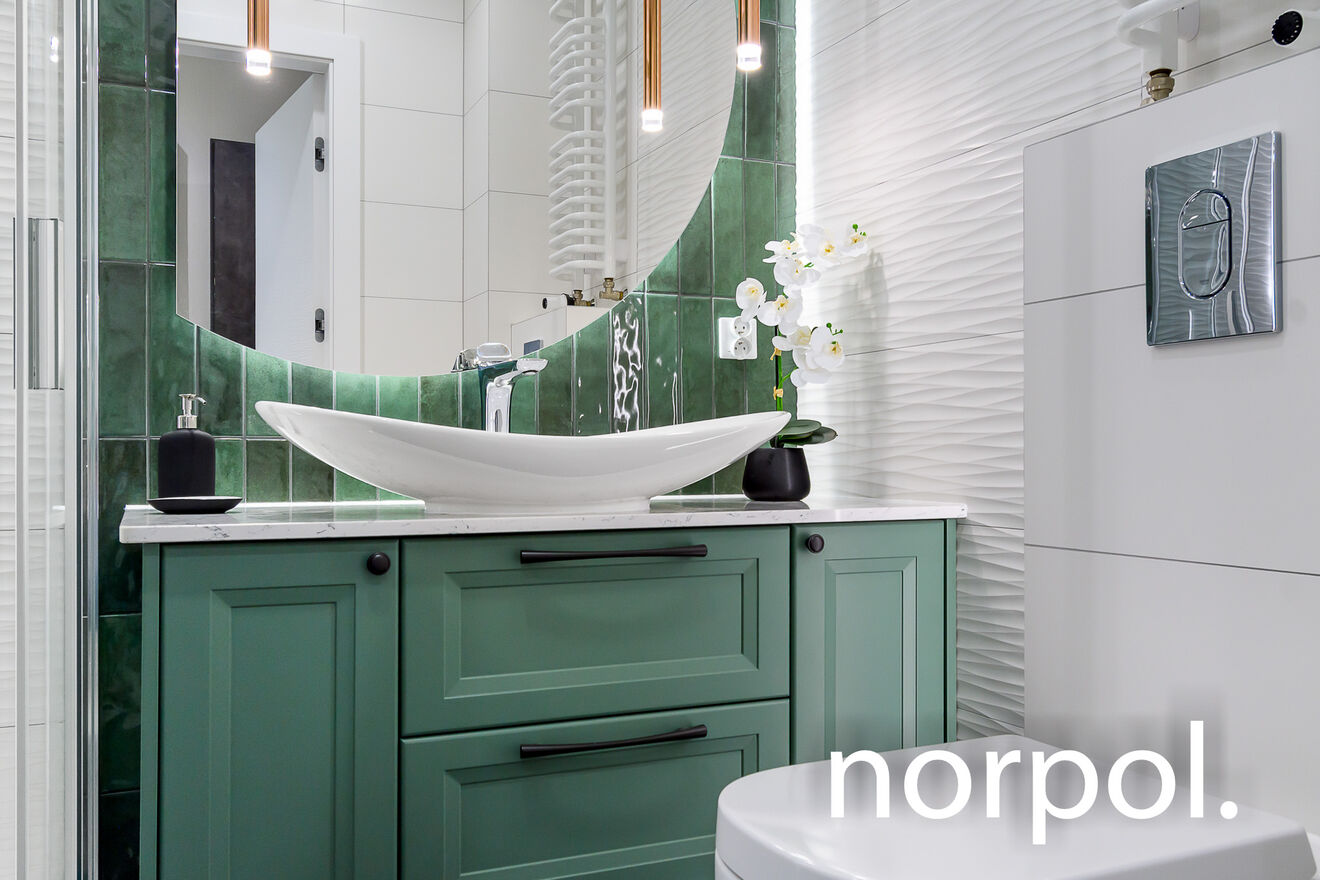 Łazienka została zaprojektowana w nowoczesnym, dopracowanym stylu, z wykorzystaniem wysokiej klasy ceramiki i armatury. Całość uzupełnia efektowne oświetlenie LED, które podkreśla strukturę materiałów i nadaje wnętrzu wyjątkowego charakteru. Przemyślane rozwiązania, takie jak duże podświetlane lustro czy funkcjonalna zabudowa, zapewniają wygodę codziennego użytkowania.