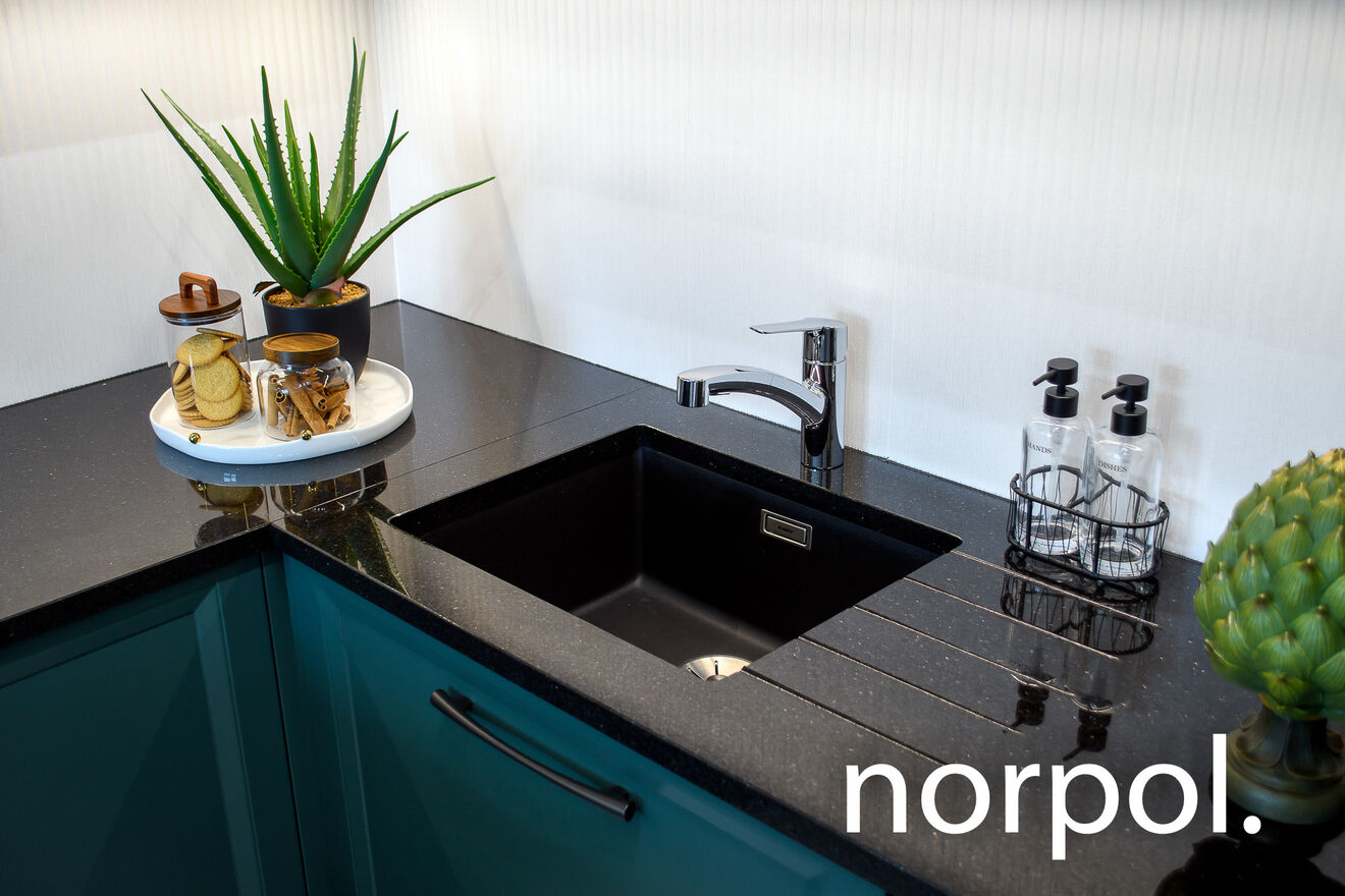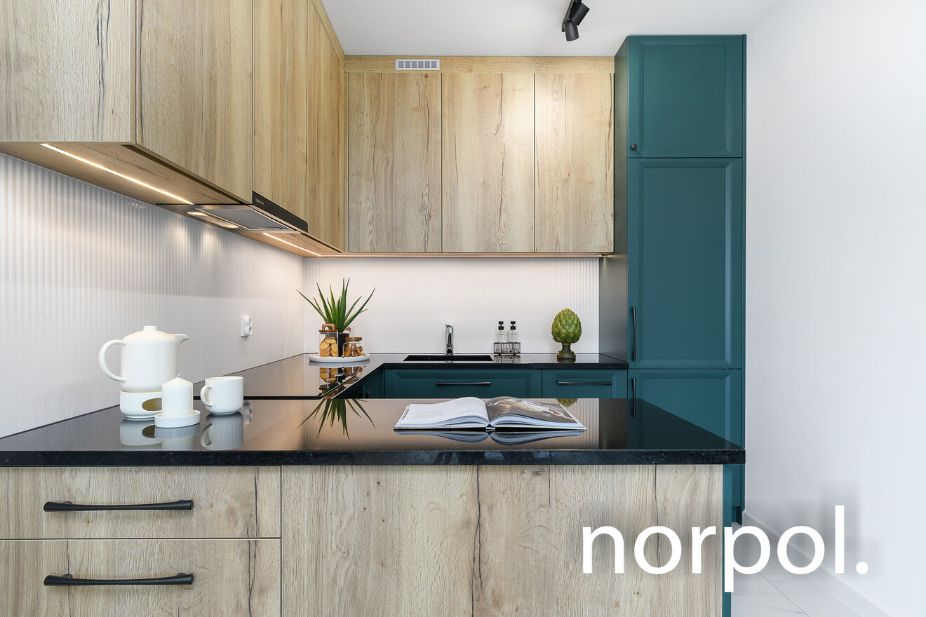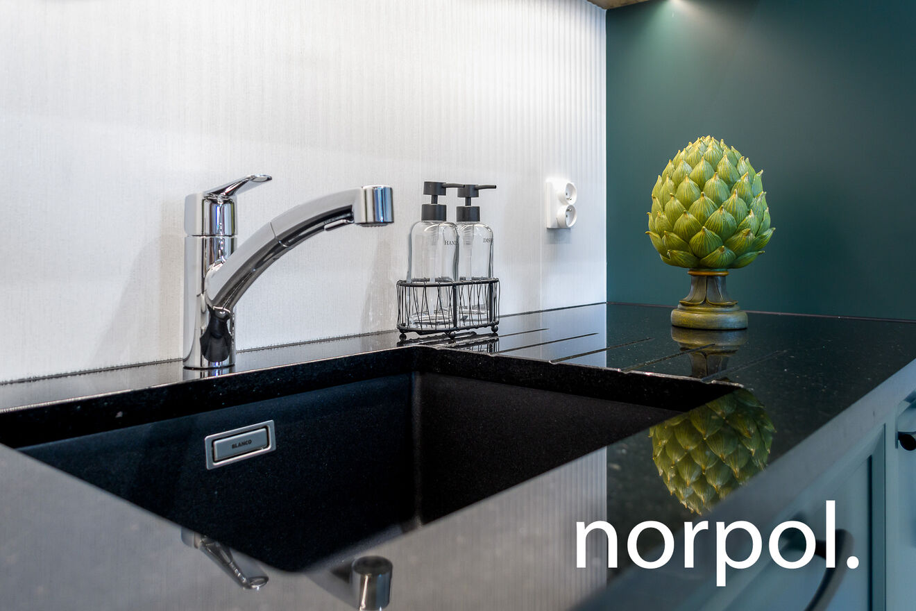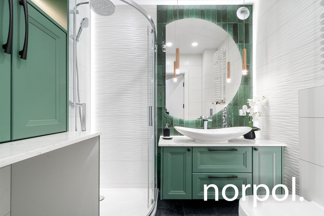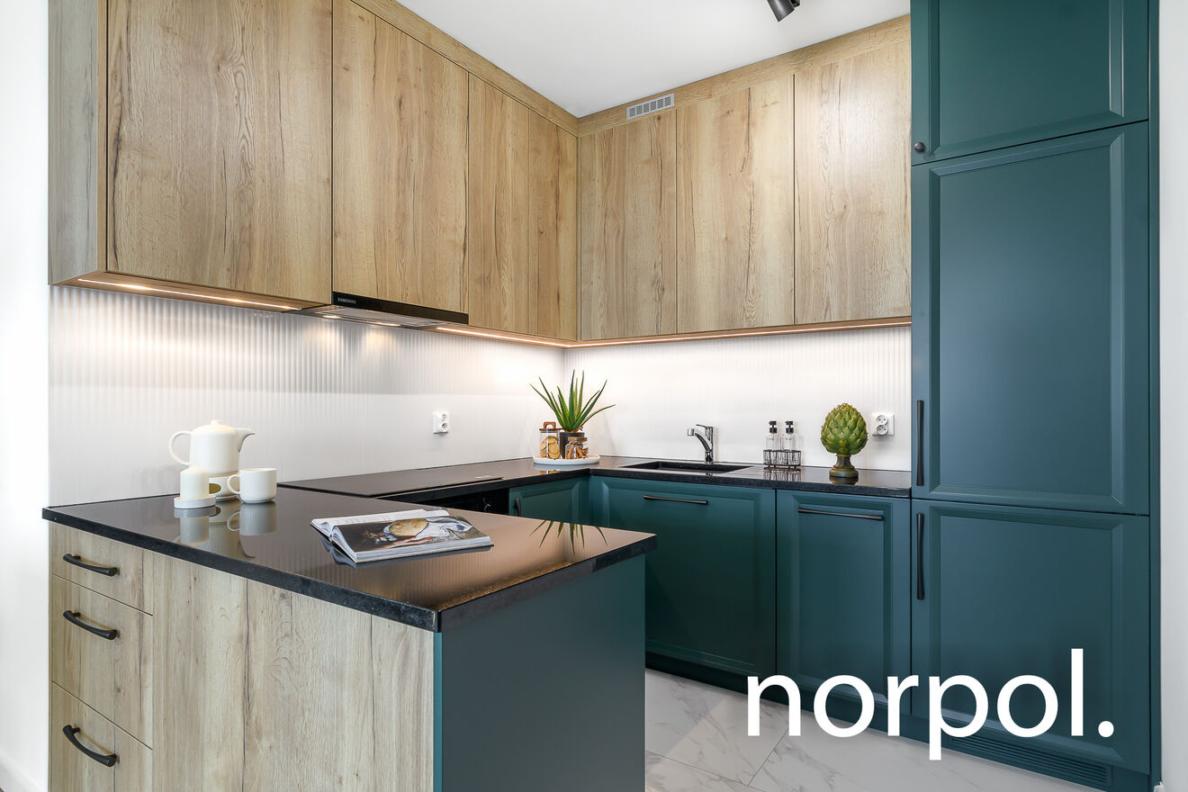 W kuchni jest elegancka zabudowa w modnym odcieniu zieleni, uzupełniona o sprzęt AGD renomowanych marek oraz nowoczesne oświetlenie. Całość została zaprojektowana tak, aby była zarówno estetyczna, jak i praktyczna.