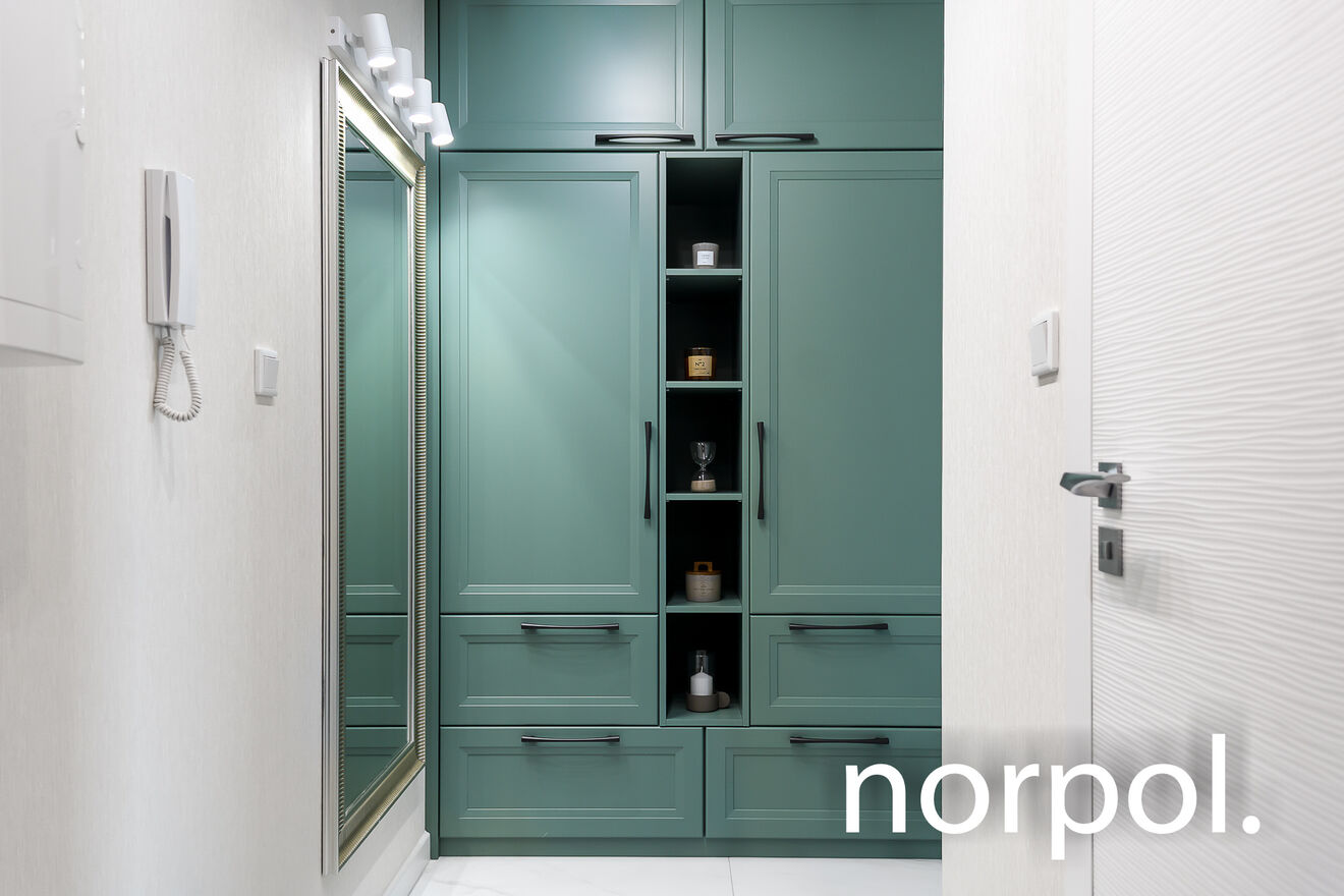 The kitchen features elegant units in a fashionable shade of green, complemented by appliances from renowned brands and modern lighting. The entire apartment has been designed to be both aesthetically pleasing and practical.