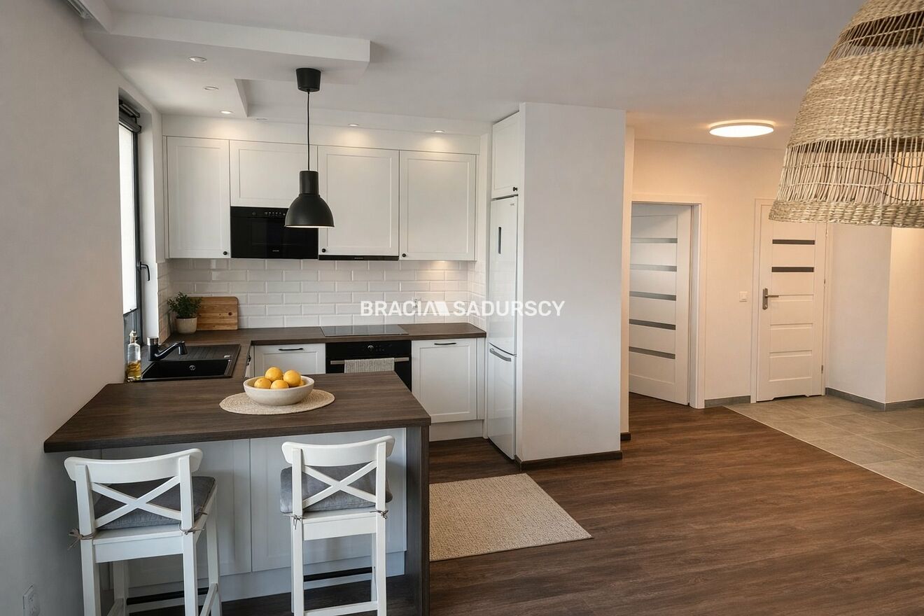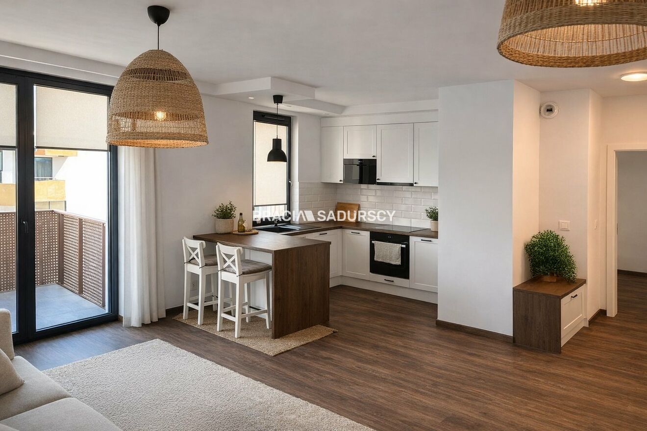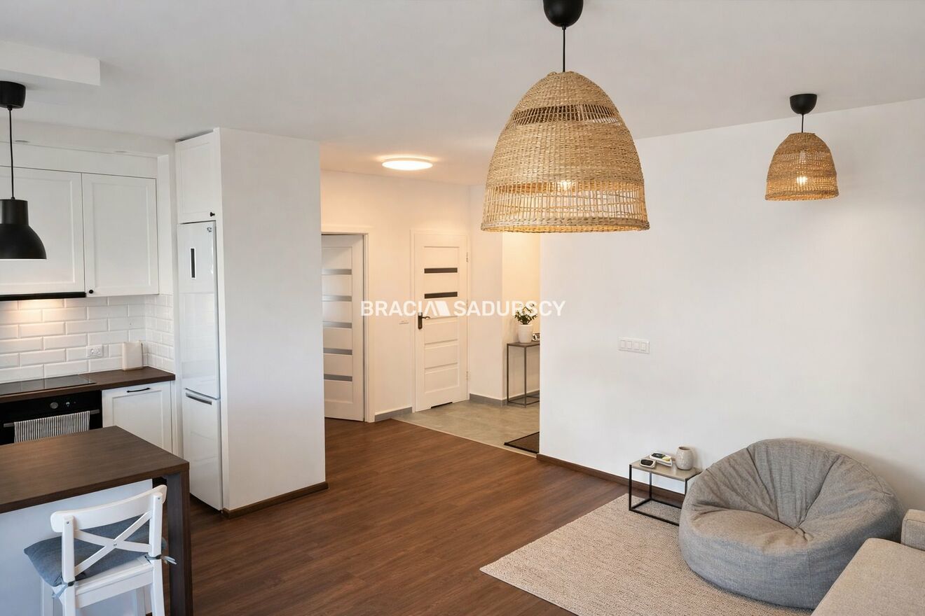 Mieszkanie zostało wyposażone zostało w stylu neutralnym, także łatwo będzie nadać mu indywidualny styl. Kuchnia jest w pełni wyposażona i ma swoje okno, także gdyby była taka potrzeba można ją lekko podzielić do salonu ścianką działową. W łazience znajduje się kabina prysznicowa.
