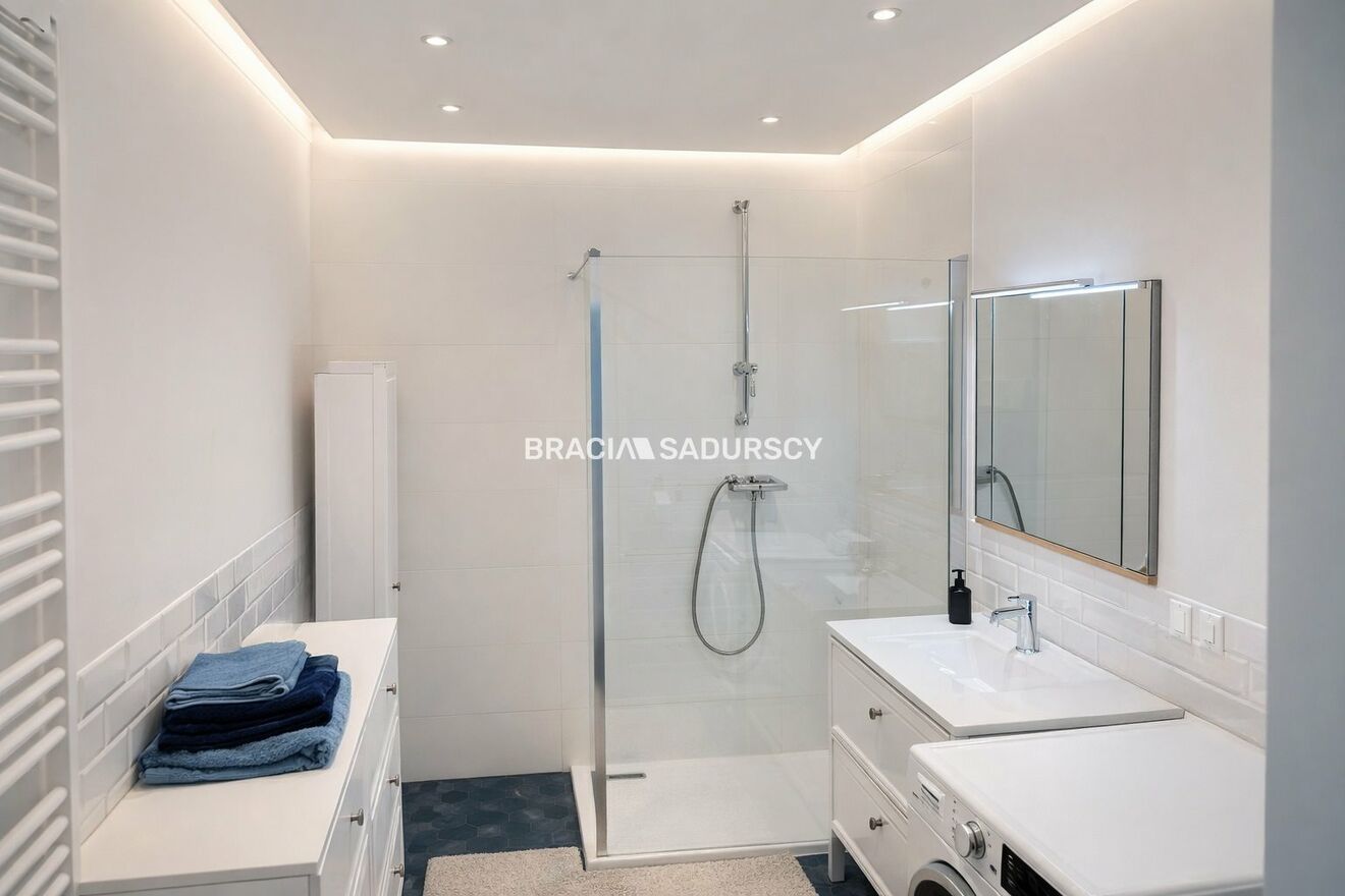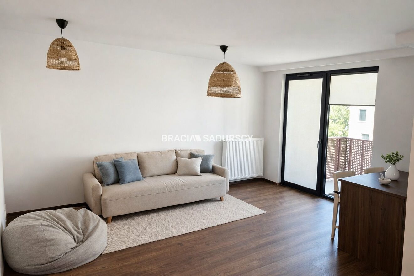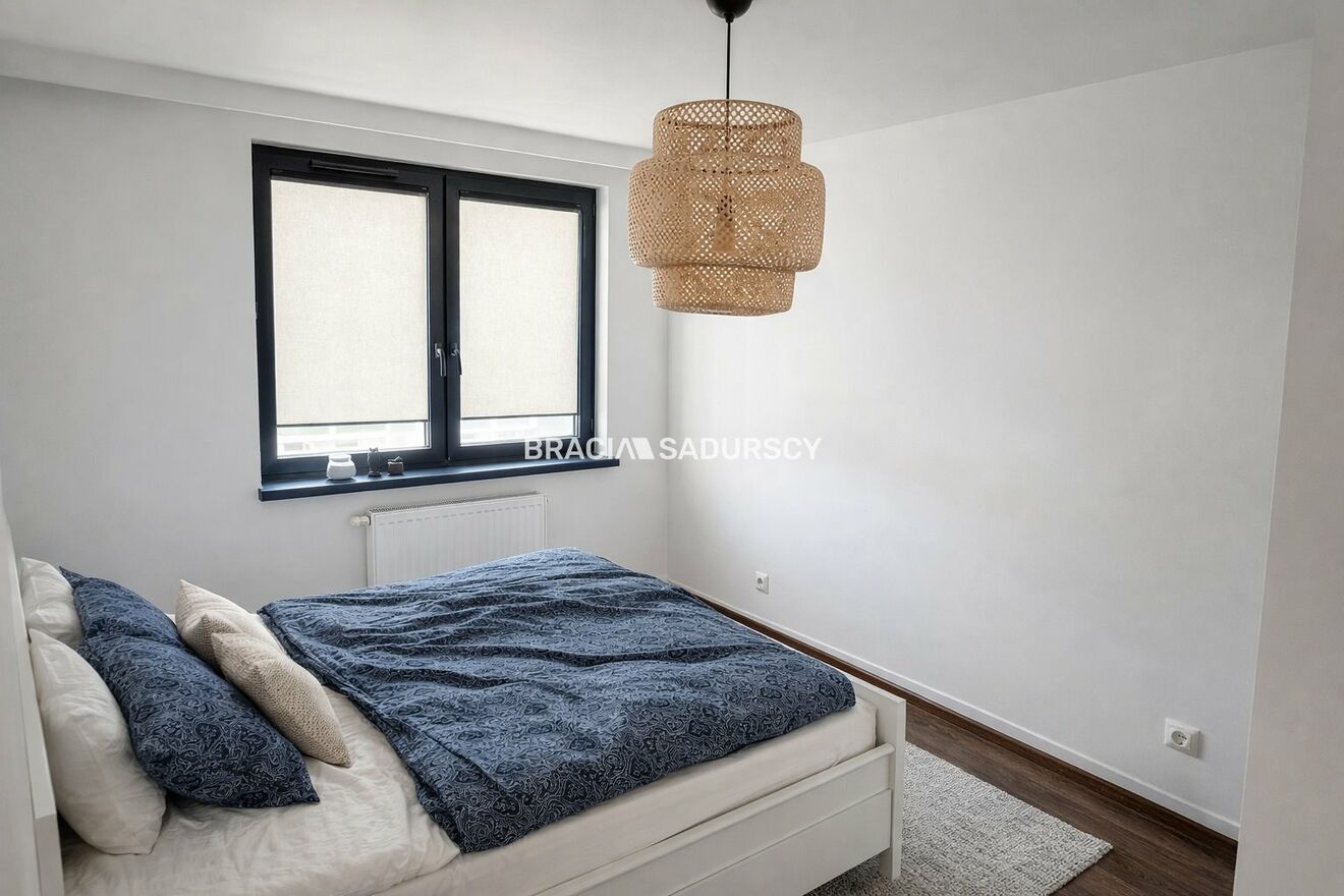 Mieszkanie zostało wyposażone zostało w stylu neutralnym, także łatwo będzie nadać mu indywidualny styl. Kuchnia jest w pełni wyposażona i ma swoje okno, także gdyby była taka potrzeba można ją lekko podzielić do salonu ścianką działową. W łazience znajduje się kabina prysznicowa.