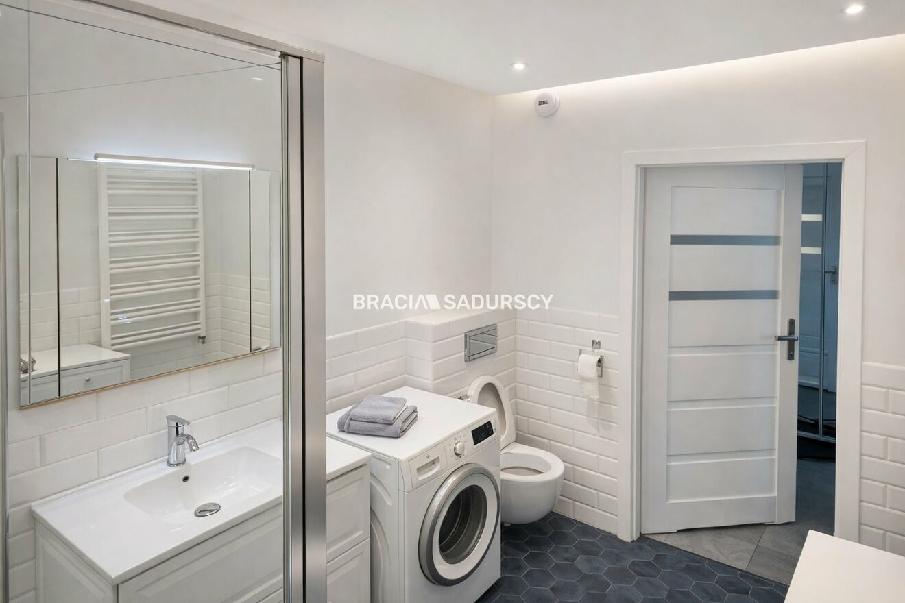 Wyposażenie łazienki: WC, umywalka, prysznic, pralka, lustro |